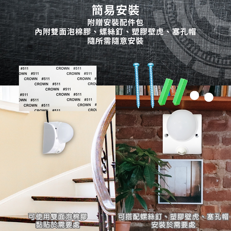 - 內附螺絲釘、壁虎、塞孔帽、雙面膠,方便安裝於所需的地方。