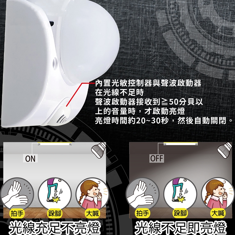 - 本產品由聲控+光控組合控制設計,雙重感應組合為生活環境更節電。