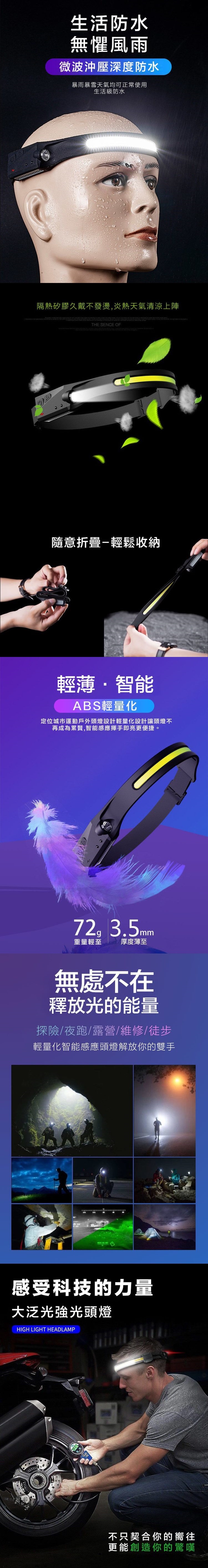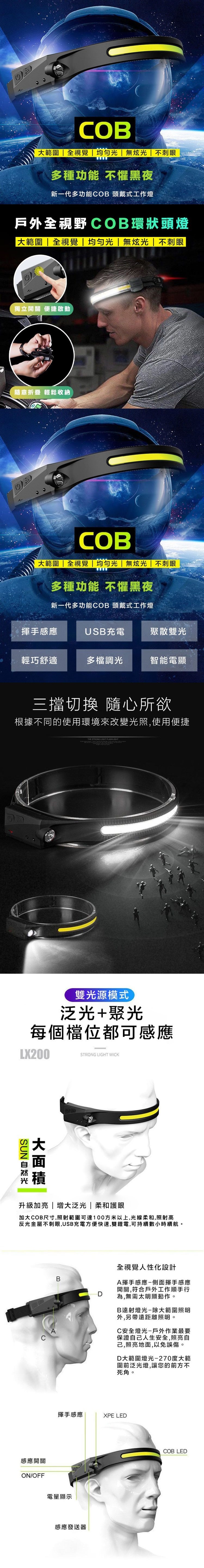 加大COB尺寸,升級加高,增大泛光,270度清楚無死角,光線柔和照射高反光金屬不刺眼,手感應模式,免觸摸輕鬆開啟,具有泛光燈與遠射燈,可依據需求調整,IPX4生活防水,防潑水,模式指示燈,輕鬆辨別所用模式,1200mAh大容量電池,超長續航20小時,智能輕薄,隨意折疊,輕鬆收納