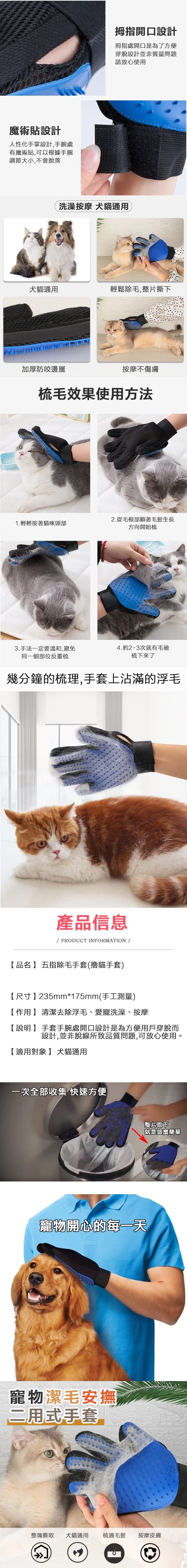 人性化手掌設計,手腕處魔鬼粘設計,可調整大小好掌控不易脫落,五指靈活設計,手套上有按摩顆粒,舒適材質、柔軟無害,輕輕一摸,安撫/刷毛/按摩同步完成,刷毛後只要輕輕一撕就能整片去除,毛小孩舒適,家裡好乾淨