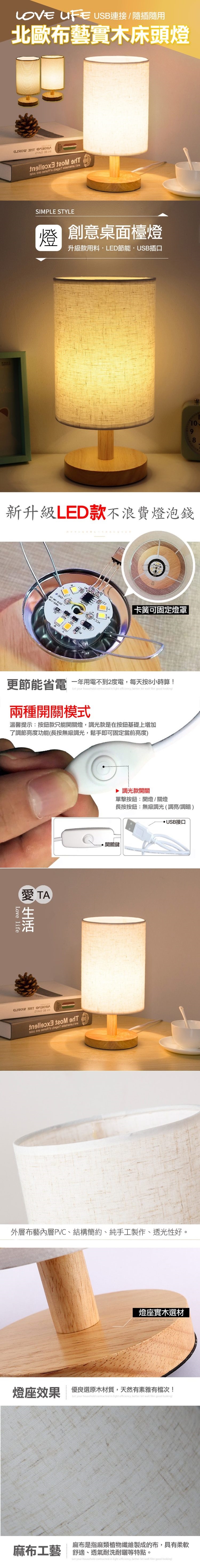 升級LED節能款光源,低功率節能省電,光線柔和時尚光影,護眼無藍光不閃頻,精緻唯美麻布工藝,簡單提升生活品質,麻布質感燈罩,舒適透氣持久耐用,天然原木底座,素雅純樸質感加分,USB供電設計,多場景適用