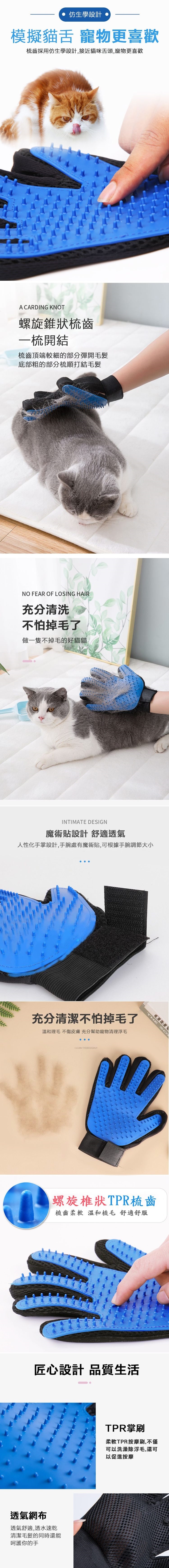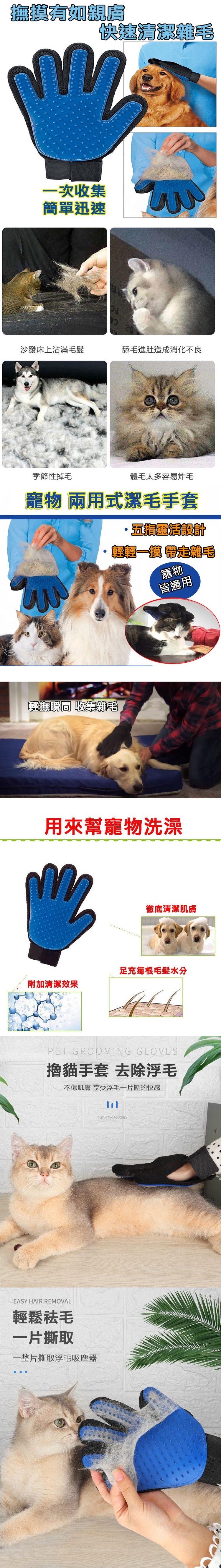 人性化手掌設計,手腕處魔鬼粘設計,可調整大小好掌控不易脫落,五指靈活設計,手套上有按摩顆粒,舒適材質、柔軟無害,輕輕一摸,安撫/刷毛/按摩同步完成,刷毛後只要輕輕一撕就能整片去除,毛小孩舒適,家裡好乾淨