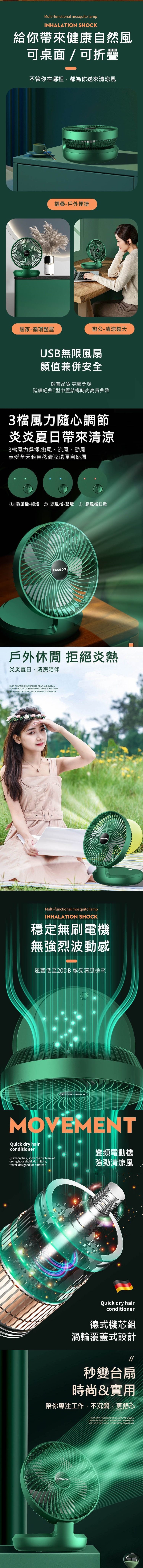 時尚設計,高貴典雅,低靜音電風扇,靜風愜意安心睡眠,舒適安靜,可依需求選擇適合風速,移動電源連接,USB供電,特殊摺疊設計能輕鬆收納、不占空間