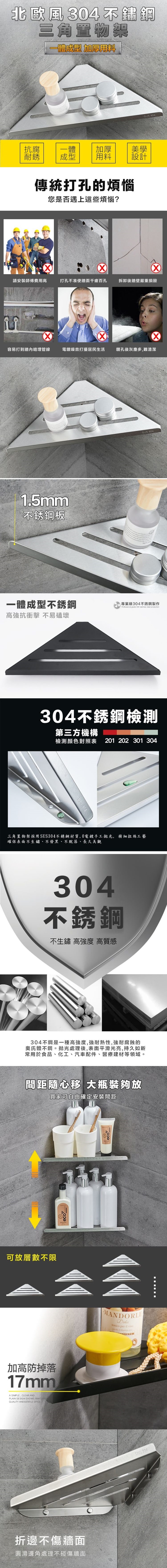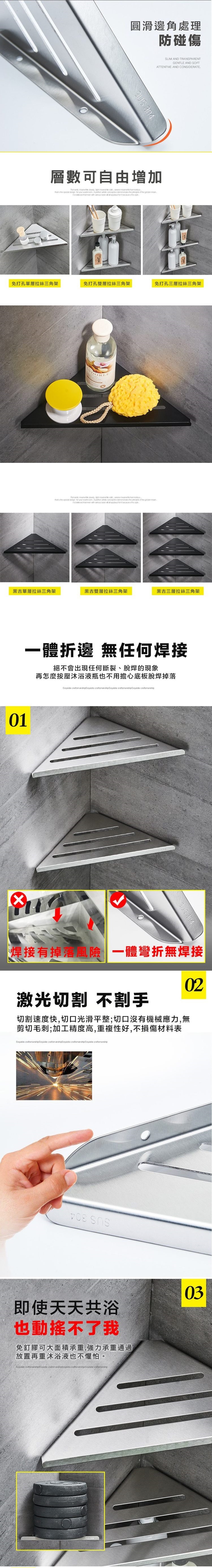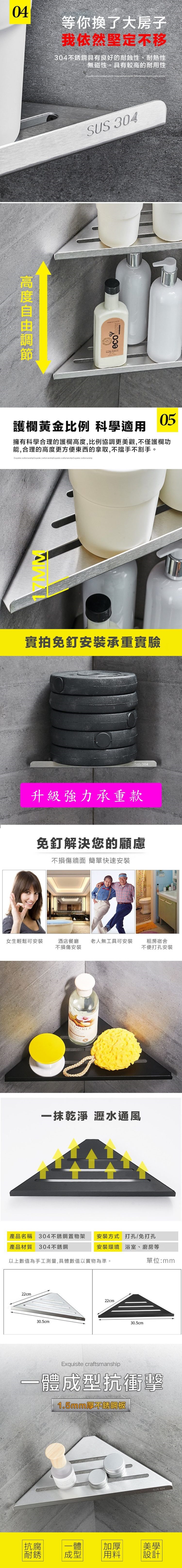 304不鏽鋼材質,防腐耐潮,堅固耐用,免釘免鑽,輕鬆安裝不傷牆面,加厚鋼板,一體成型無焊接點,雷射切割切口光滑平整,不割手,可自由搭配隔層數量及高度間距,合理護欄高度,方便物品拿取