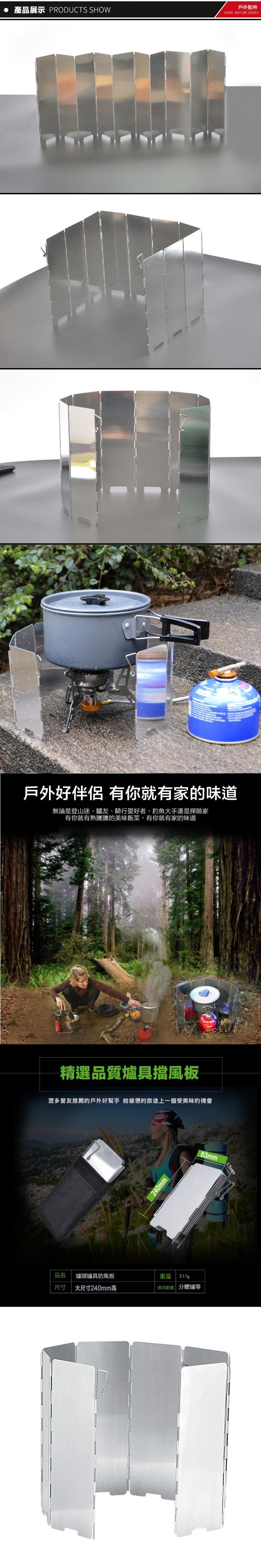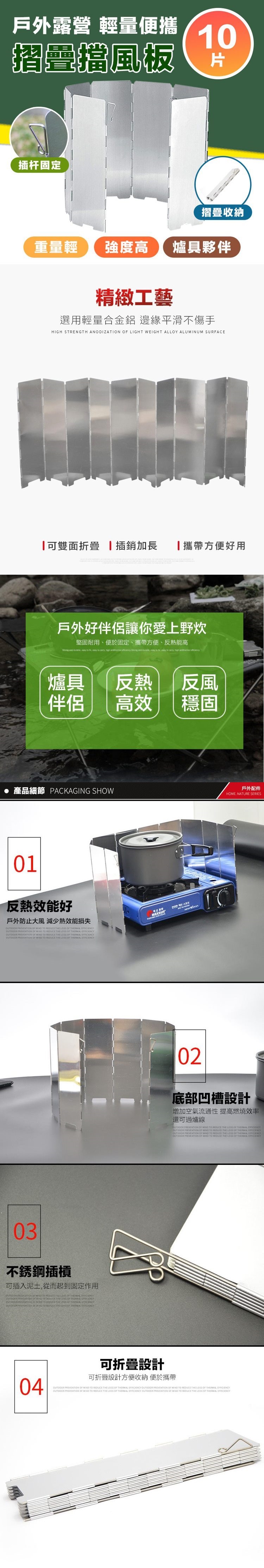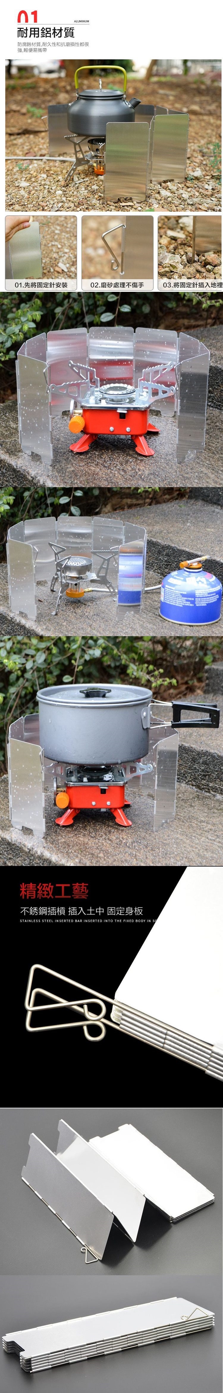 鋁合金製造,重量輕堅固耐用,易清洗保存,帶地插銷固定針,可固定於地,防止晃動,10片式設計 擋風效果更佳,底部凹槽設計,控制空氣流通,提高燃燒效能,可折疊收納,輕鬆攜帶