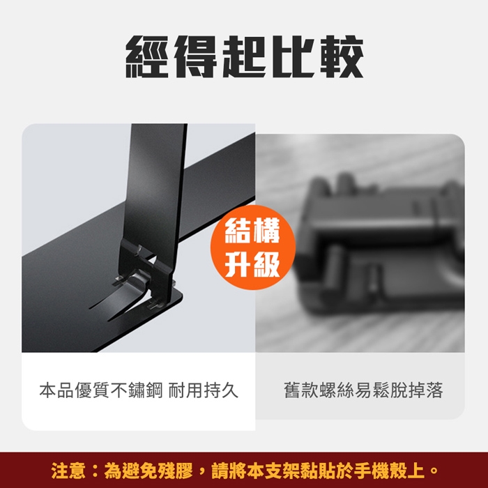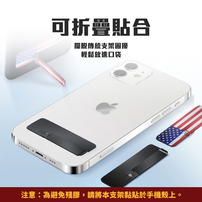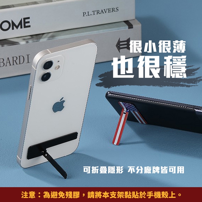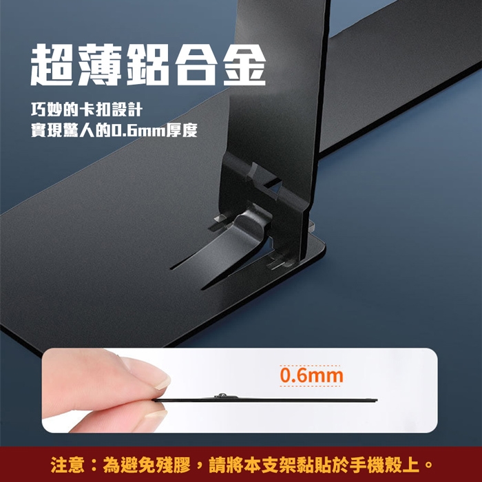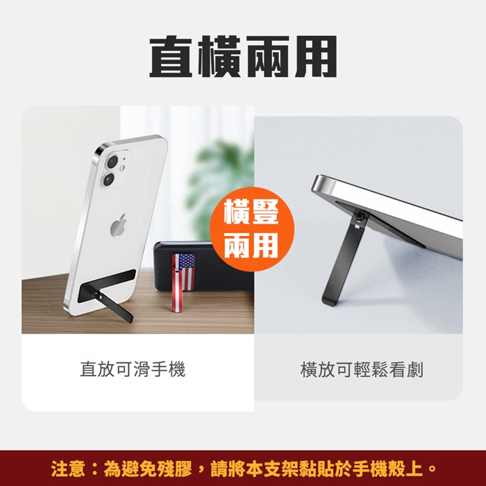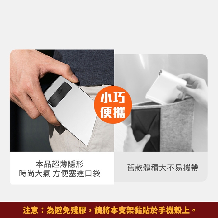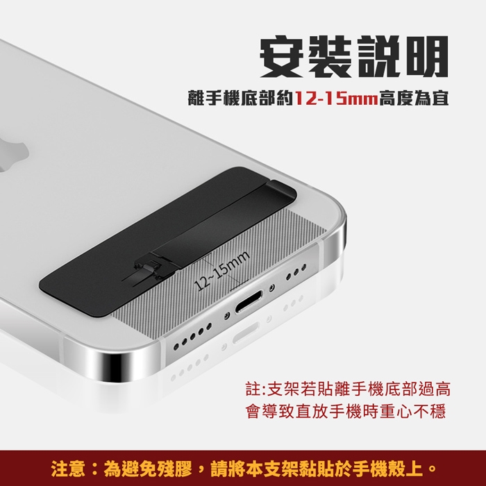 請將本支架黏在手機殼上,以免殘膠傷害手機。