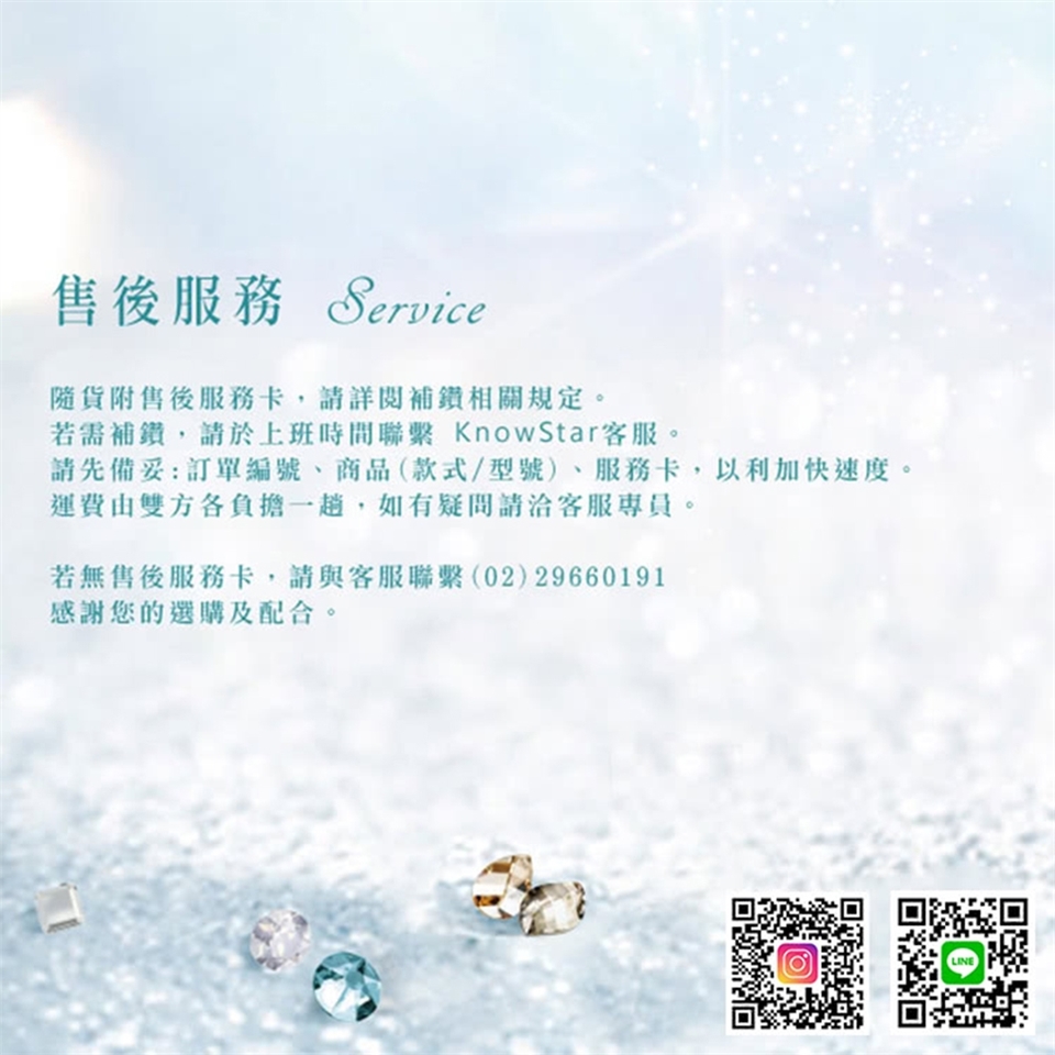 ※凡購買KnowStar商品,會隨貨附一張售後服務卡,購買皆享有免費補鑽服務,若需補鑽,請將商品及售後服務卡寄回KnowStar原廠