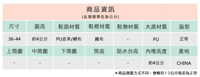 2.鞋類商品依功能及用途之不同,鞋底各有其止滑係數之個別不同,使用鞋類商品請用於正常平坦之路面,非雨鞋或雨靴類商品,請避免穿著於下雨濕滑路面上行走。