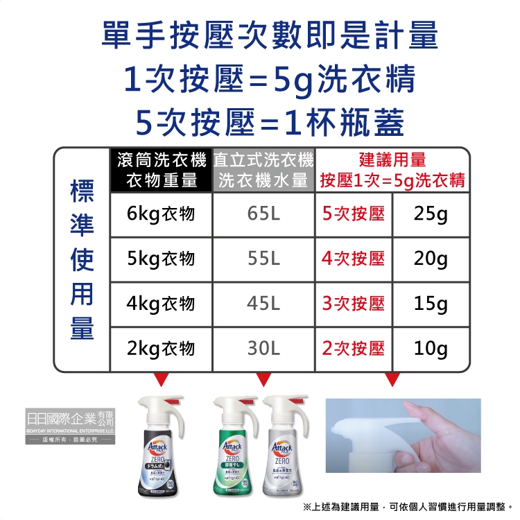 1.衣物重量6kg:5次按壓(25g)