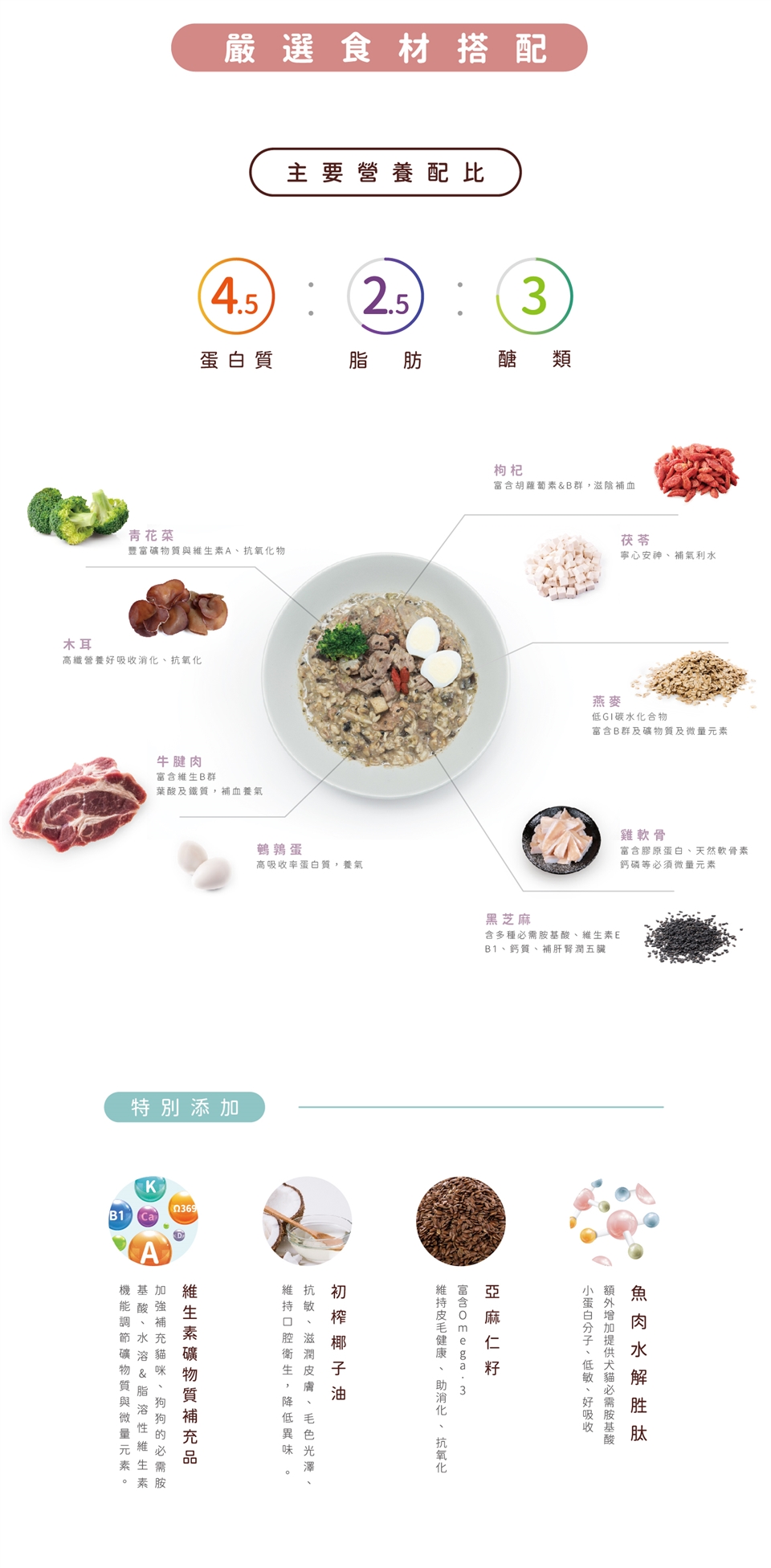 ● 寵膳鮮味主食概念為食療養生,並非治療功效,如毛孩有任何特殊狀況應協尋專業獸醫。