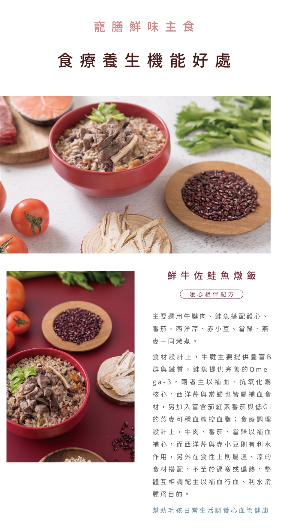 食療調理上: 牛肉、番茄、當歸以補血、補心,而西洋芹與赤小豆則有利水作用,另外在食性上則屬溫、涼的食材搭配,不至於過寒或偏熱,整體互相調配主以補血行血、利水消腫為目的【幫助毛孩日常生活調養心血管健康】。