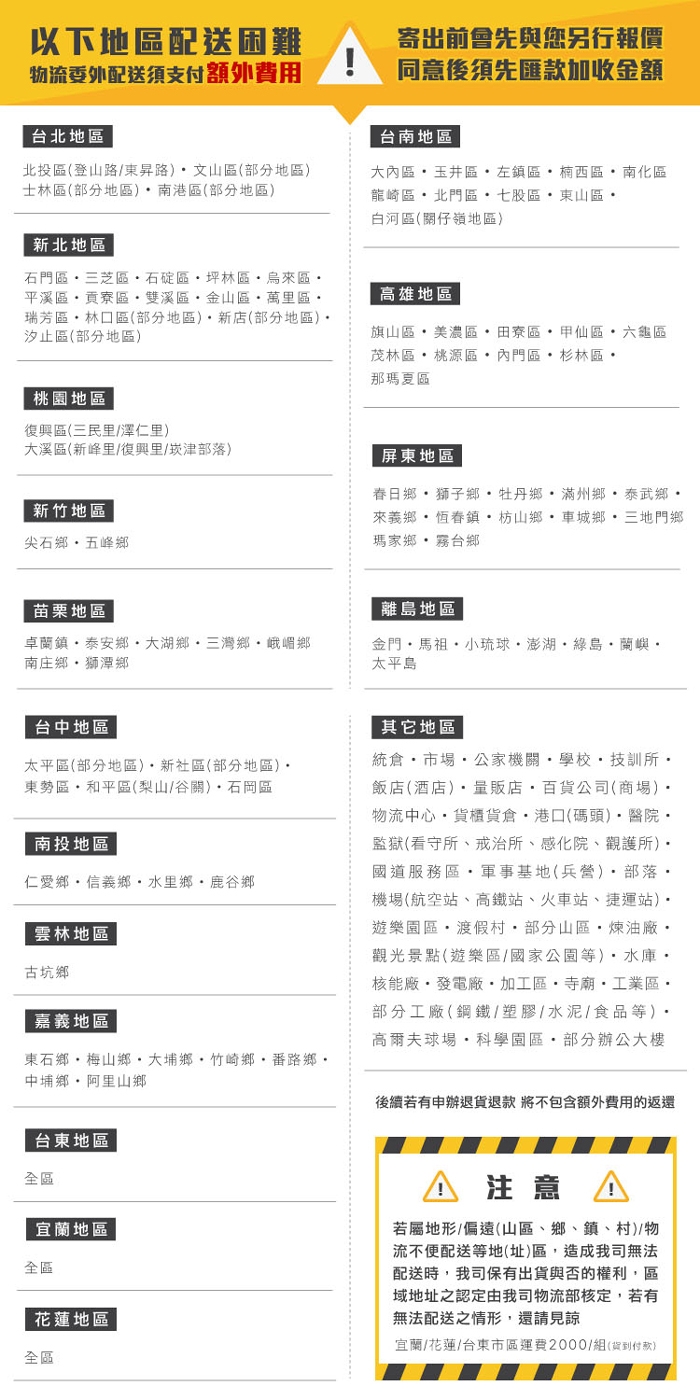 商品顏色因螢幕解析度不同可能導致色差,依實際商品樣式為準。br/購買前請先測量使用範圍以免造成尺寸不合無法使用之情況。br/鑑賞期非試用期,尚未考慮是否需要退換貨時,請勿拆封使用。br/退換貨需用原紙箱運輸,且不得於紙箱上書寫字樣,鑑賞期內請保留所有包裝及配件,避免影響您的退貨權益。br/商品售出如經拆封、使用拆解導致商品缺乏完整性及失去再販售價值時,需負擔整新費用。br/本商品不包含拍攝用道具。br/br/配送範圍僅限台灣本島,離島無配送。br/商品僅配送至收貨地址一樓,無協助搬運上樓,若有需要請自行與配送司機協調。br/商品一旦寄出後,若需變更配送地址則會收取轉運費用。br/br/偏遠地區區域之認定由我司配合物流核定。br/上述(額外費用)寄出會先與您收取(需先匯款+收金額)後續若有申辦退貨退款時,將不包含(額外費用)的返還。