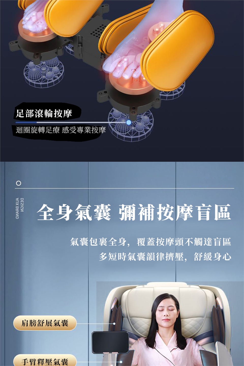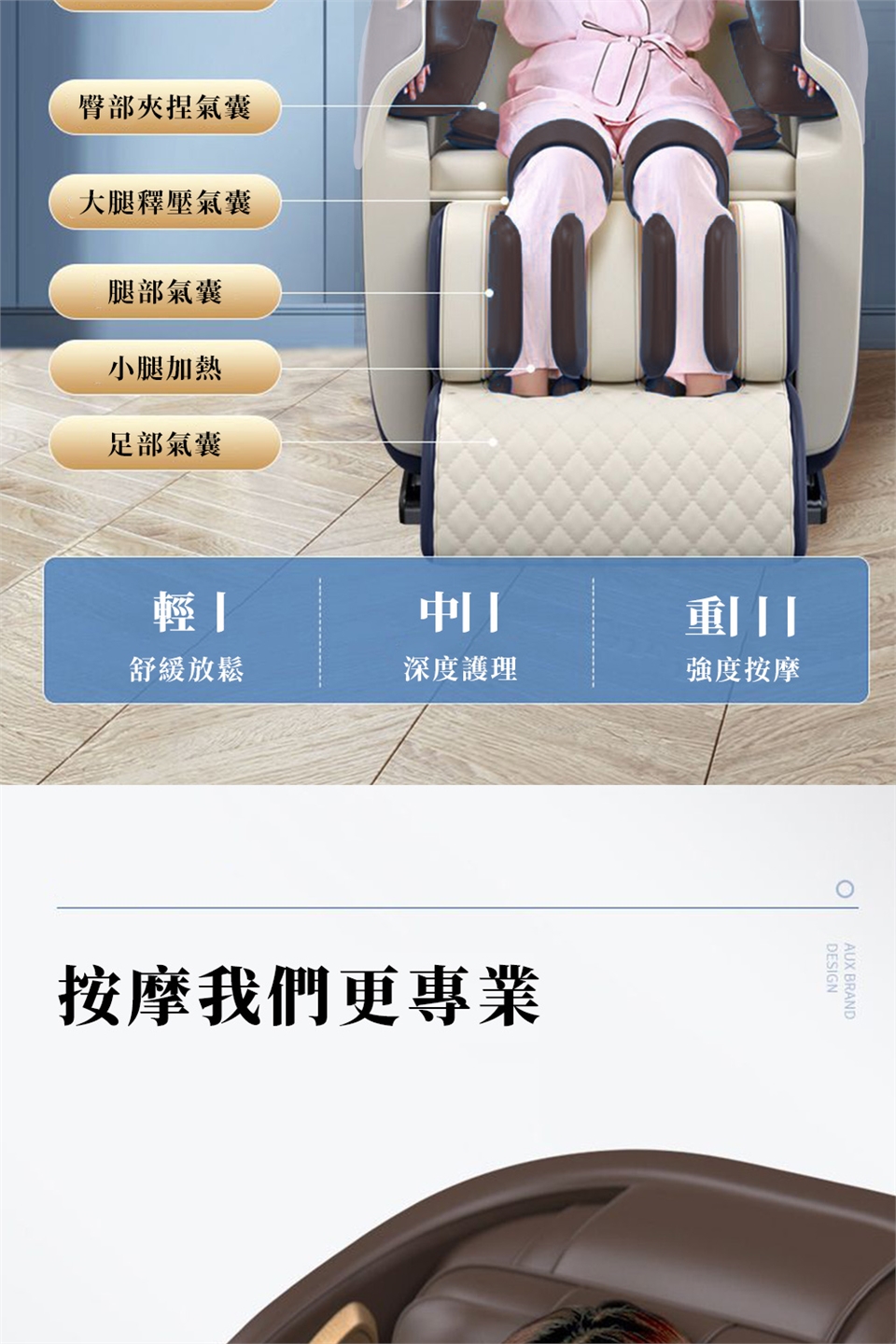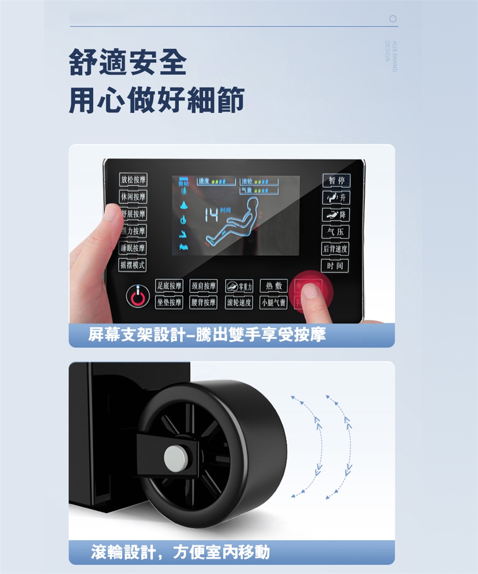 按摩原理 :振動,熱敷,氣壓,滾輪