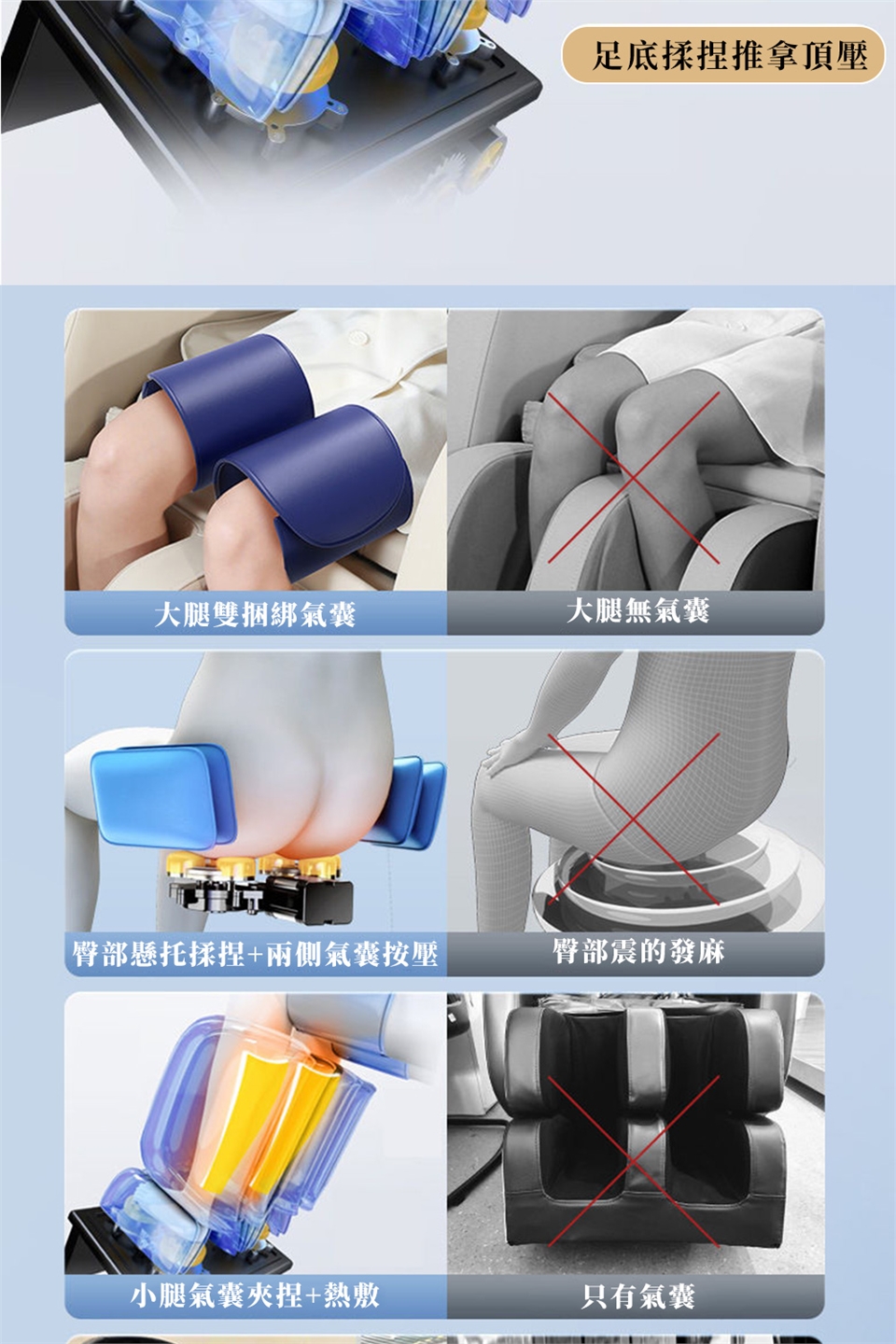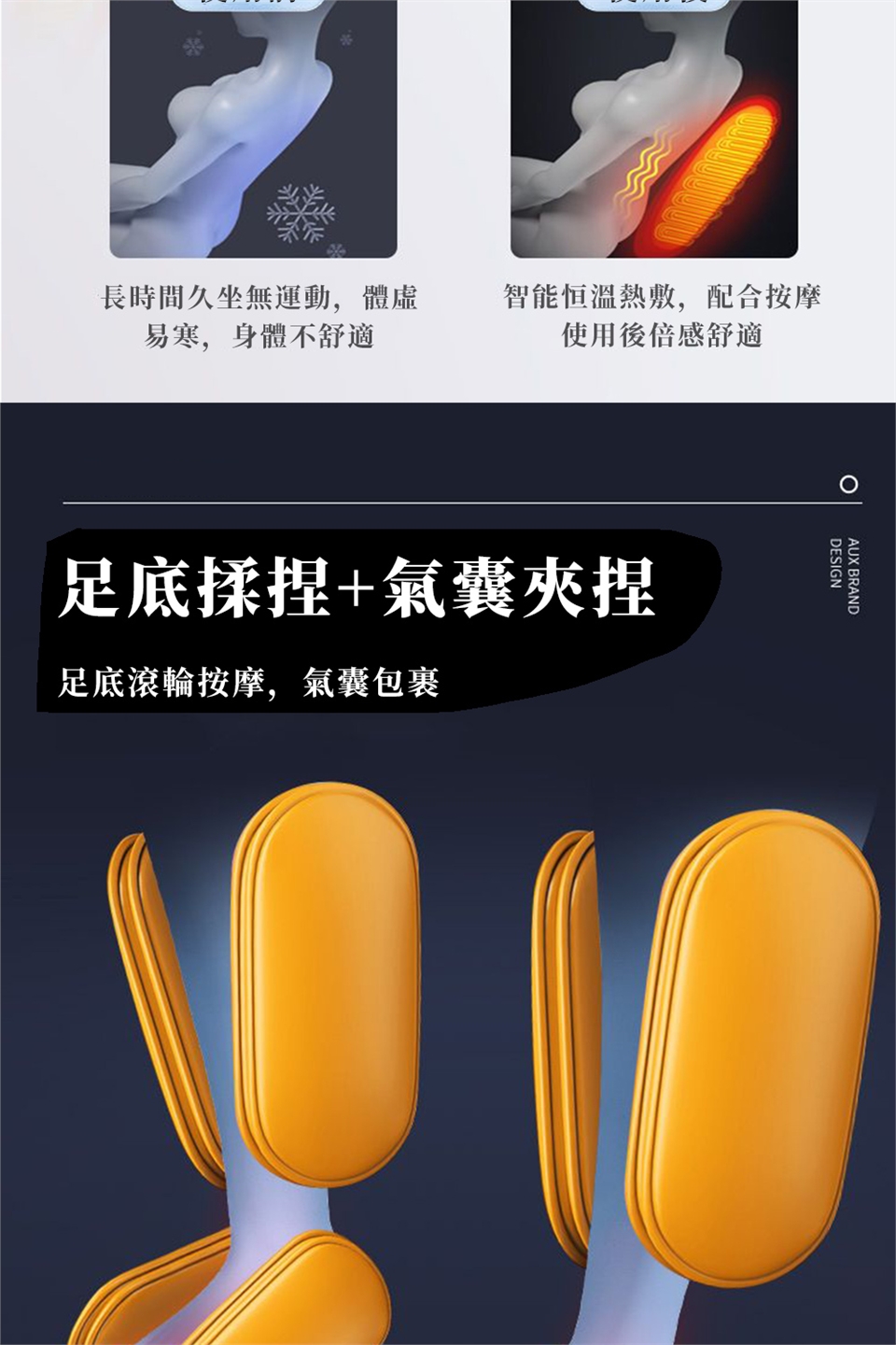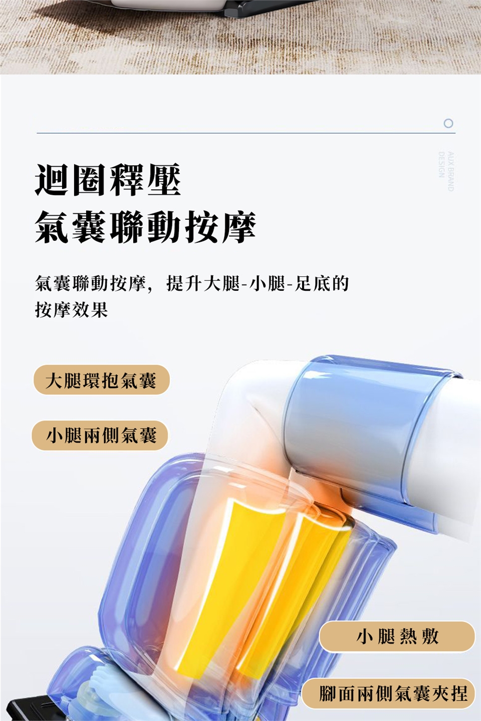 按摩原理 :振動,熱敷,氣壓,滾輪