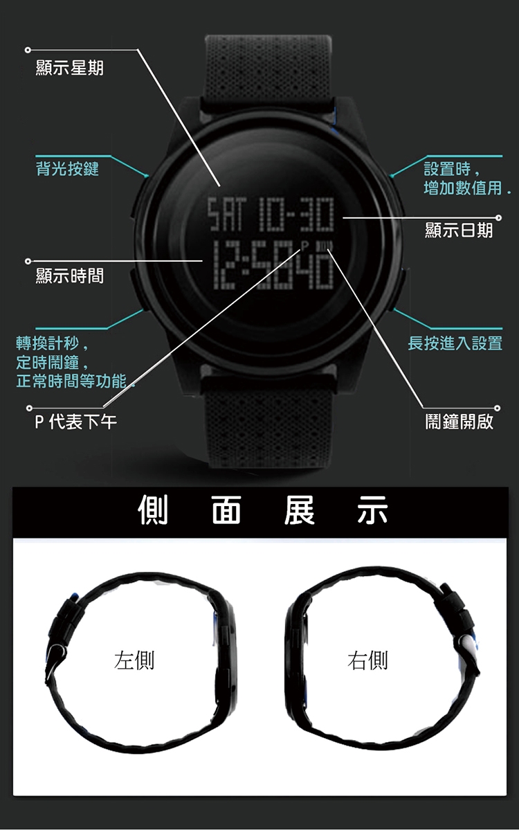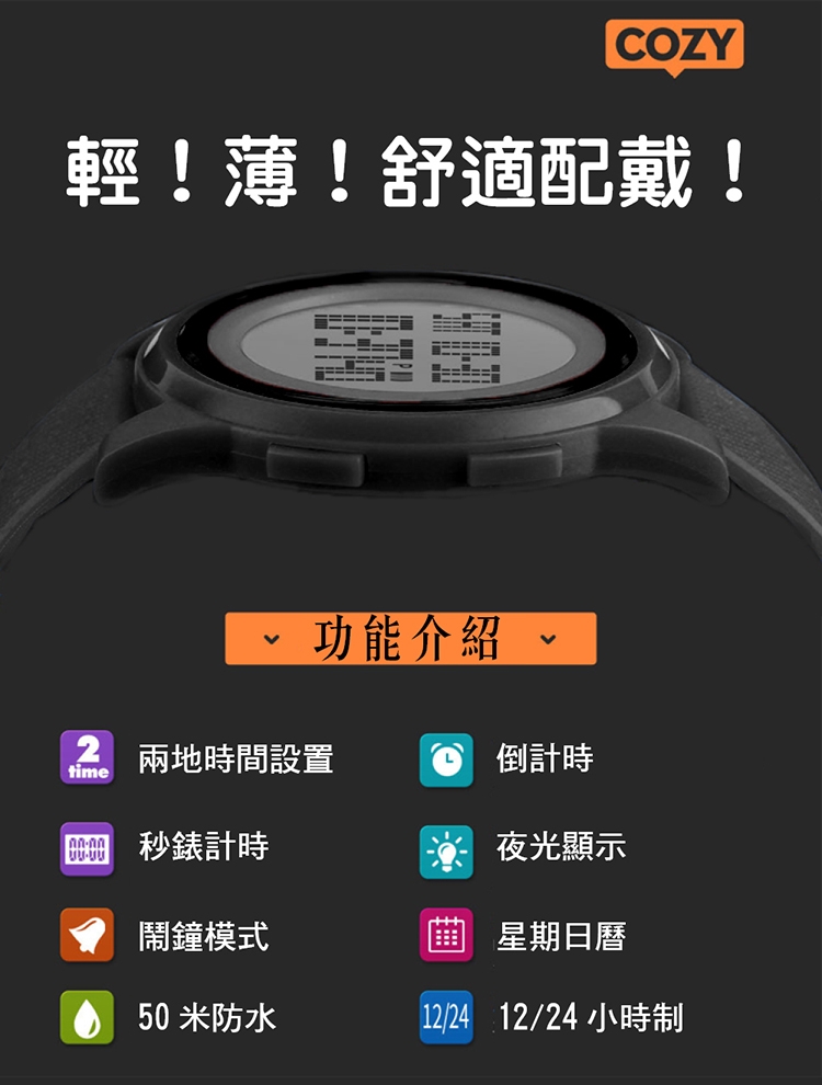 產品功能:時間、秒錶顯示、日期顯示、夜光LED