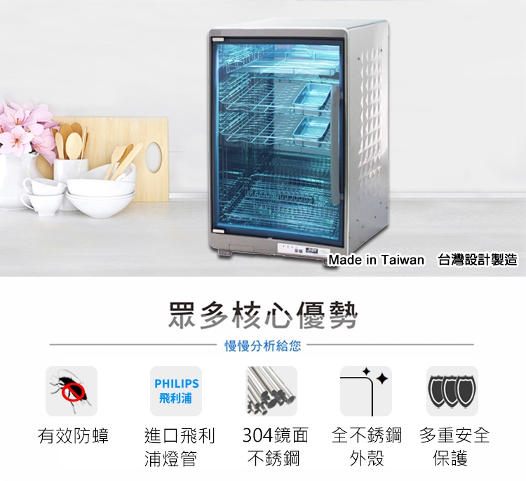#304不銹鋼外殼、內裝、碗籃、活動側架,清洗容易,乾淨、衛生