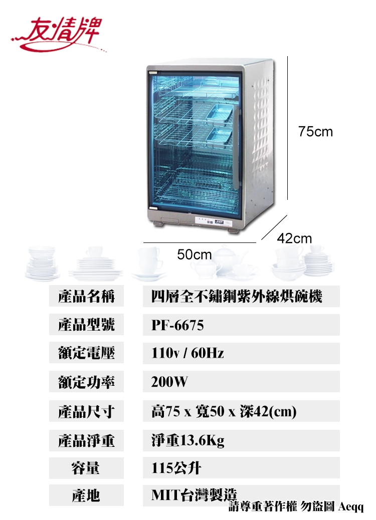 【友情牌】115L四層全不繡鋼紫外線殺菌烘碗機(PF-6675)雙筷盒