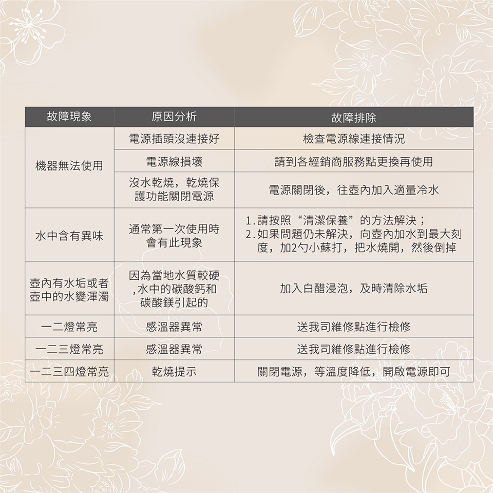 ●煮沸, 泡茶, 咖啡, 花茶, 醋飲, 調奶多重選擇