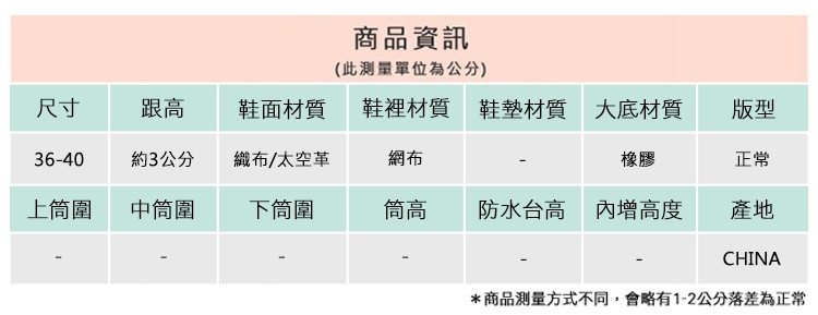 2.鞋類商品依功能及用途之不同,鞋底各有其止滑係數之個別不同,使用鞋類商品請用於正常平坦之路面,非雨鞋或雨靴類商品,請避免穿著於下雨濕滑路面上行走。
