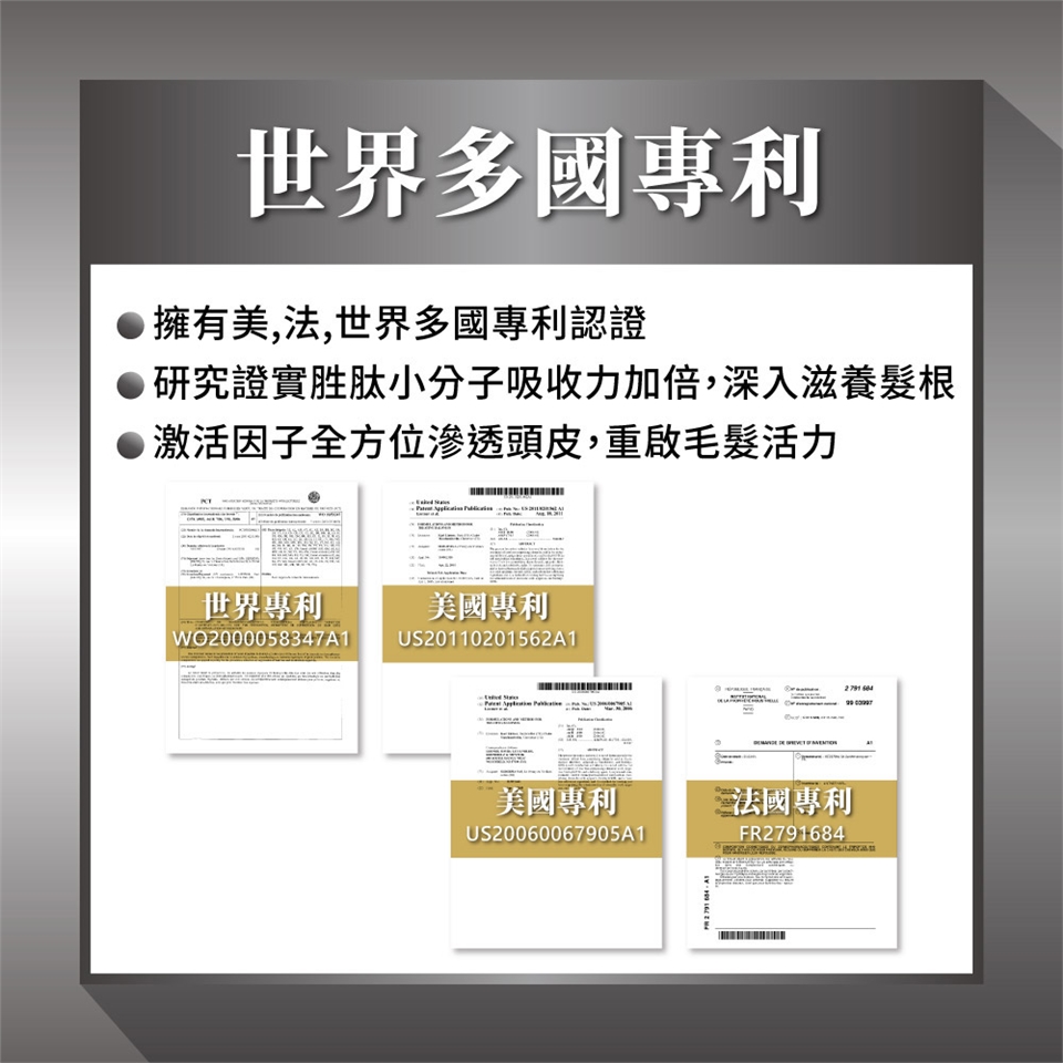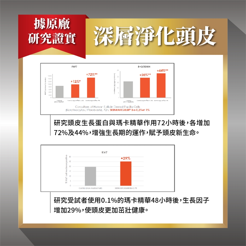 3.專利法國水解秘魯瑪卡 :70年大廠B Corps™認證實驗室研發、取自人蔘精華強韌髮根、擁有世界專利萃取技術。