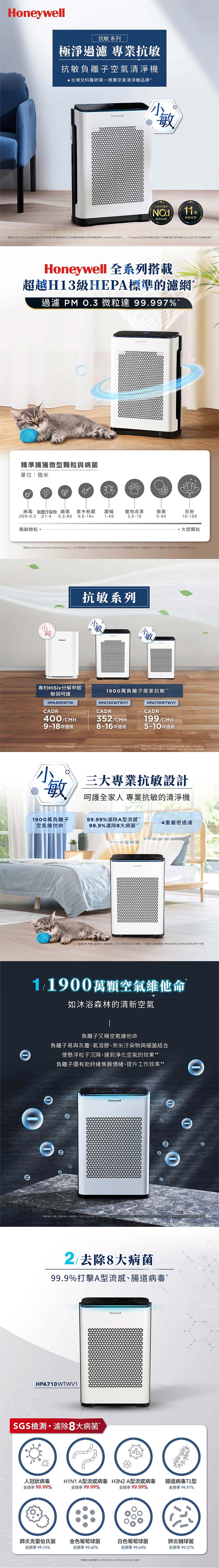 美國Honeywell 抗敏負離子空氣清淨機(小敏)運用前向進風設計及超越H13級的HEPA濾網提升進風效率,使能源運用更有效率,不但更省電,也全面提升淨化效果,自動偵測PM2.5與TVOC,利用四重過濾,包含超越H13級的HEPA濾網、超密緻蜂巢顆粒活性碳濾網、1900萬負離子等多重把關,獲得SGS 檢測99.99%濾淨人冠狀病毒、H1N1、H3N2以及其他病菌。有了小敏空氣清淨機,有效降低空氣中的過敏原與異味,讓消費者每一口呼吸都安心!