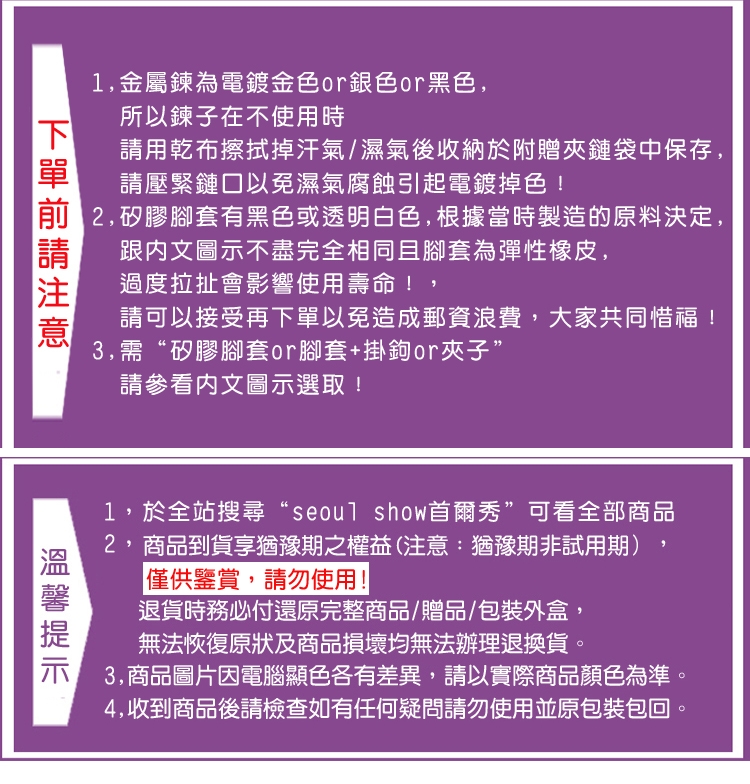 收納保養 : 1. 盡量不要接觸汗水、雨水、海水、香水及化妝品,取下後請用乾淨的乾布擦拭乾淨再做收納。