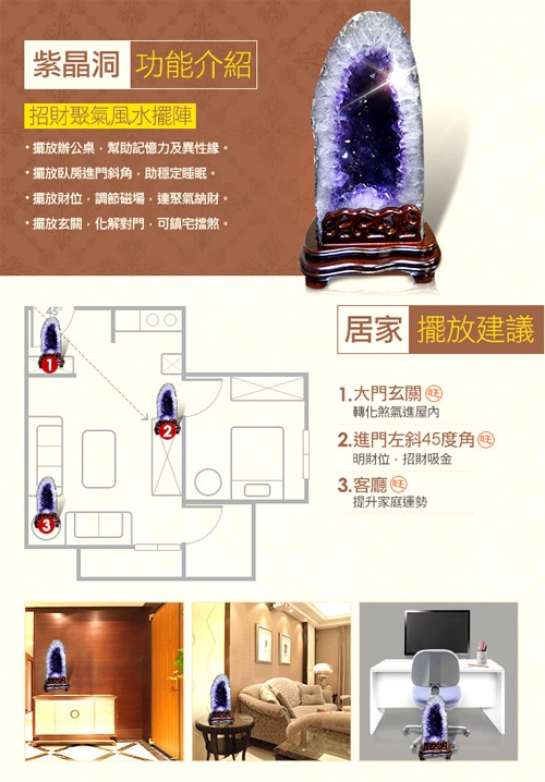 2.客廳:置於客廳的財位-客廳進門的對角位(45度角)兩片牆壁的交接處,可使財源廣進!