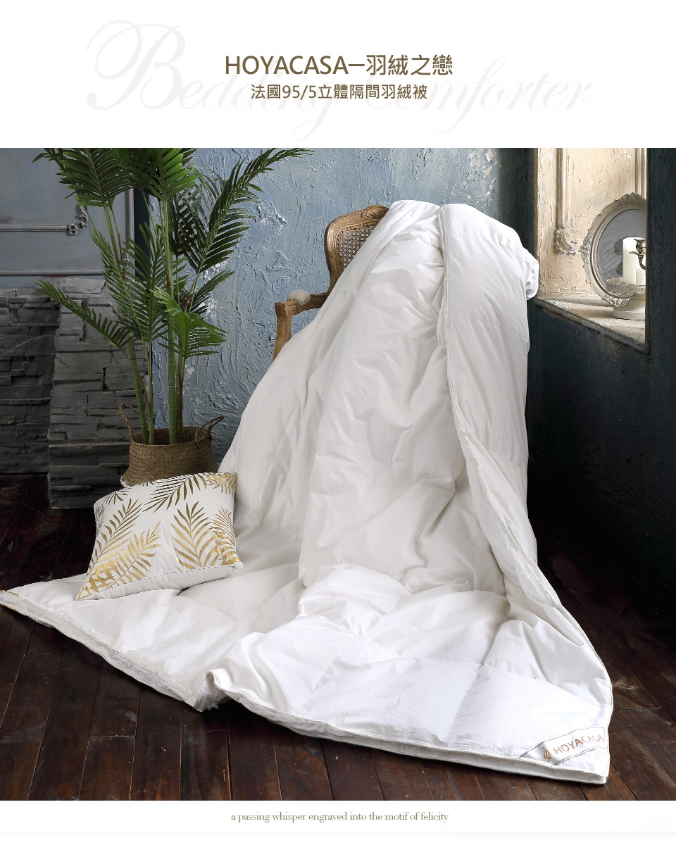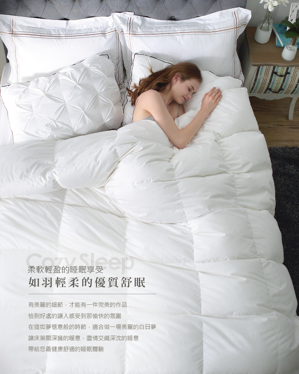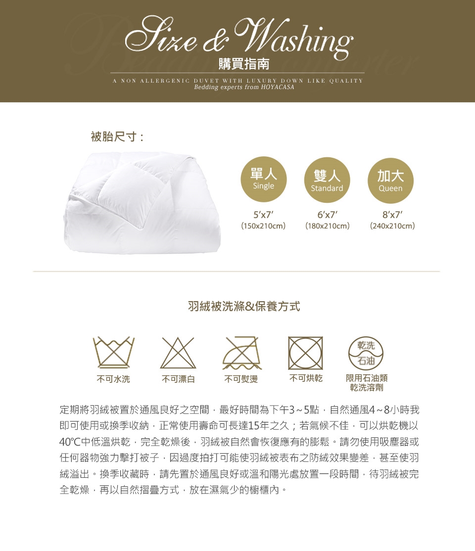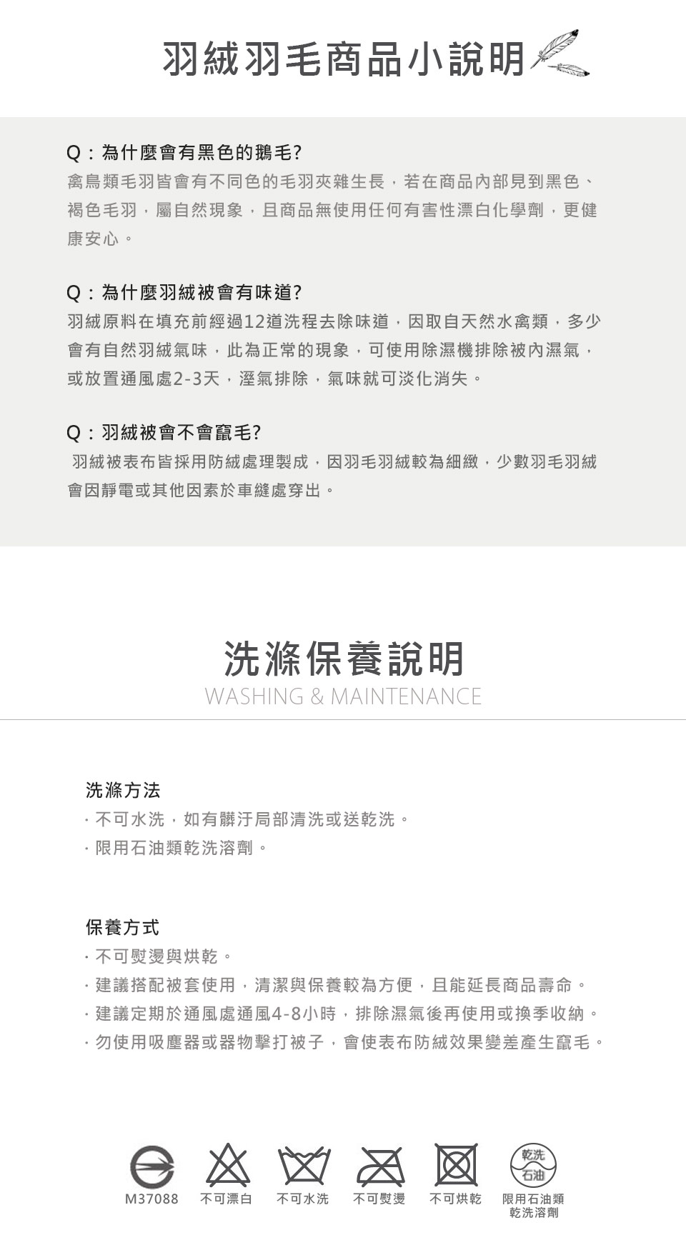 定期將羽絨被置於通風良好之空間,最好時間為下午3~5點,自然通風4~8小時,即可使用或換季收納,正常使用壽命可長達15年之久;若氣候不佳,可以烘乾機以40℃中低溫烘乾,完全乾燥後,羽絨被自然會恢復應有的膨鬆。請勿使用吸塵器或任何器物強力擊打被子,因過度拍打可能使羽絨被表布之防絨效果變差,甚至使羽絨溢出。換季收藏時,請先置於通風良好或溫和陽光處放置一段時間,待羽絨被完全乾燥,再以自然摺疊方式,放在濕氣少的櫥櫃內。