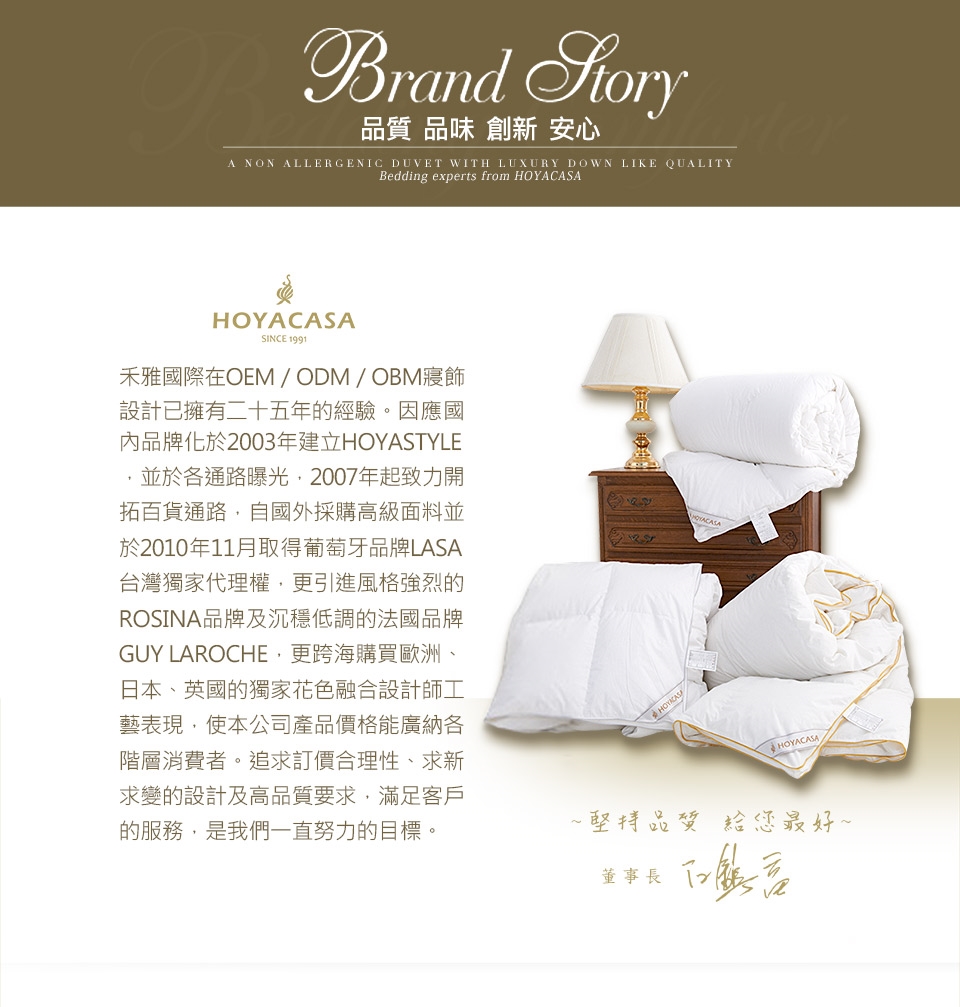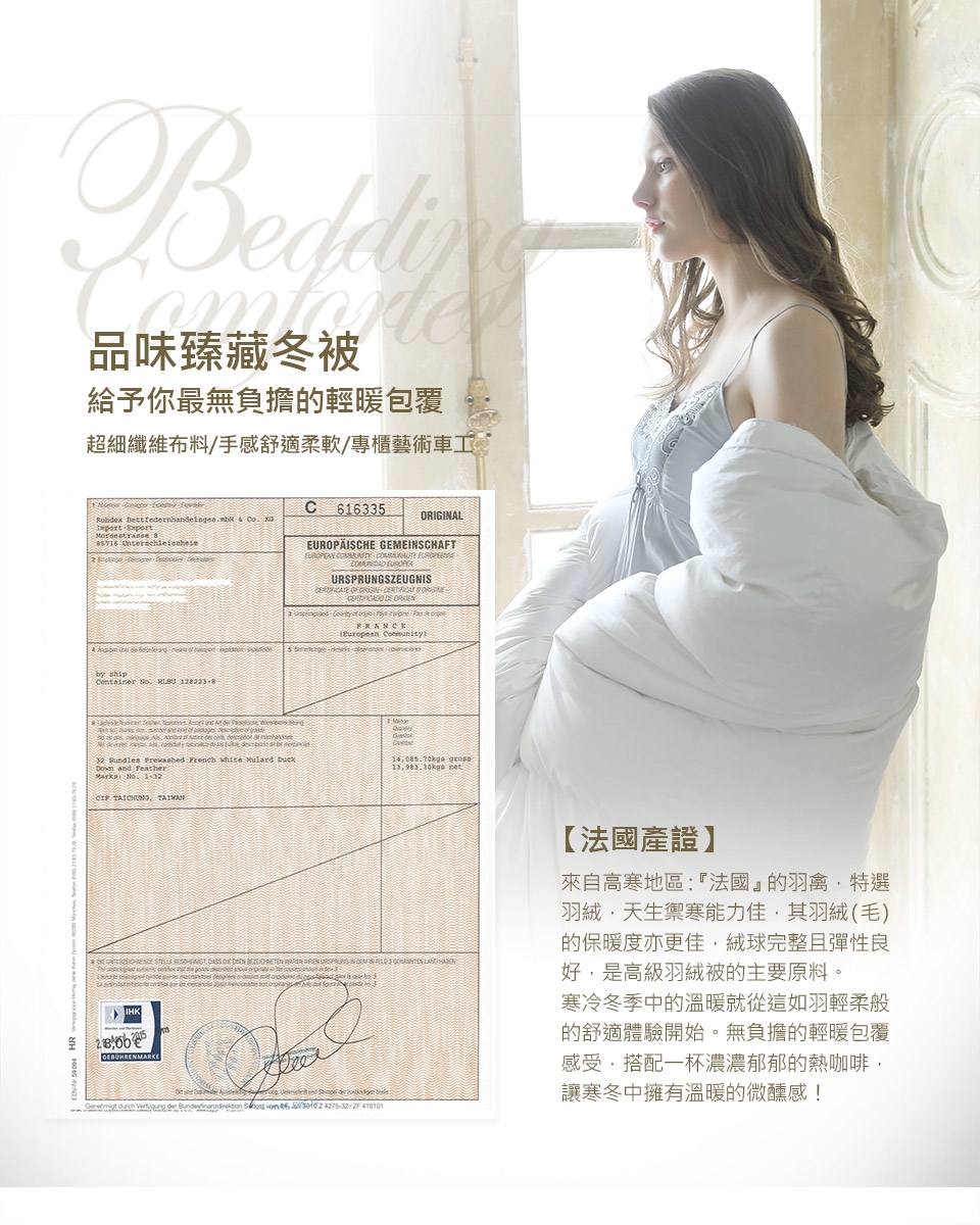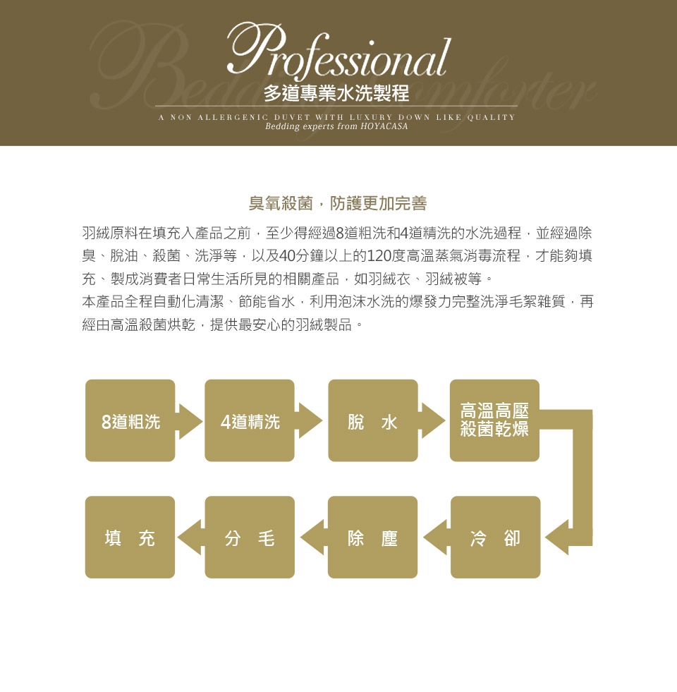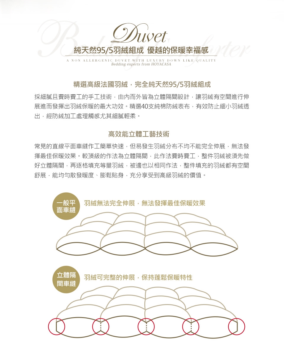 定期將羽絨被置於通風良好之空間,最好時間為下午3~5點,自然通風4~8小時,即可使用或換季收納,正常使用壽命可長達15年之久;若氣候不佳,可以烘乾機以40℃中低溫烘乾,完全乾燥後,羽絨被自然會恢復應有的膨鬆。請勿使用吸塵器或任何器物強力擊打被子,因過度拍打可能使羽絨被表布之防絨效果變差,甚至使羽絨溢出。換季收藏時,請先置於通風良好或溫和陽光處放置一段時間,待羽絨被完全乾燥,再以自然摺疊方式,放在濕氣少的櫥櫃內。