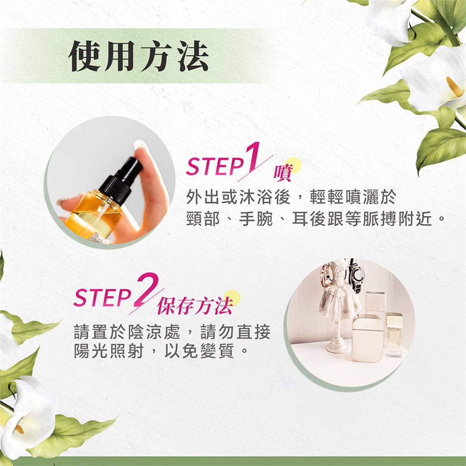 ★使用方式:直接噴撒於手挽內側或耳後肌膚,即可享受芳香。