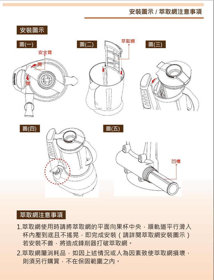 1.萃取網使用時請將萃取網的平面向果杯中央・順軌道平行滑入