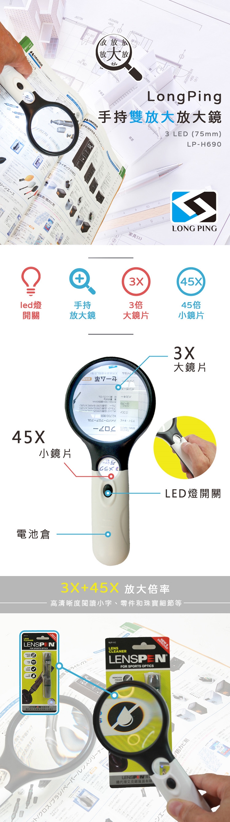 LongPing 手持雙放大放大鏡3 LED (75mm)LP-H690