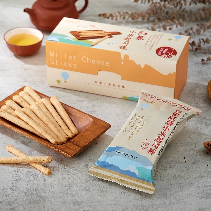 3.「台東紅藜」穀物紅寶石」,結合金黃色「台灣小米」豐富的營養,濃郁的起司香氣融和一體,讓您愈吃愈「藜」不開「米」!