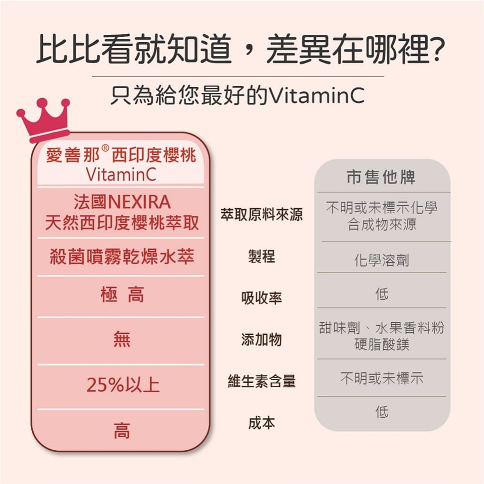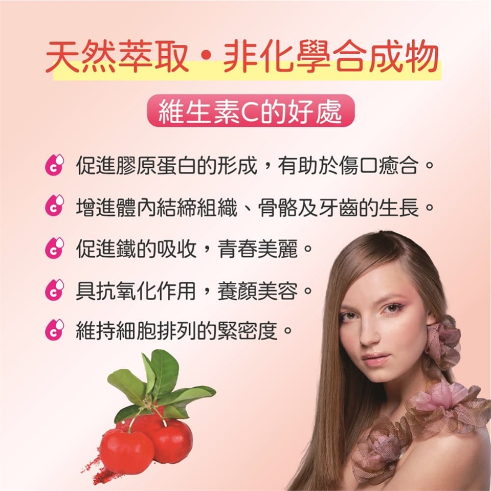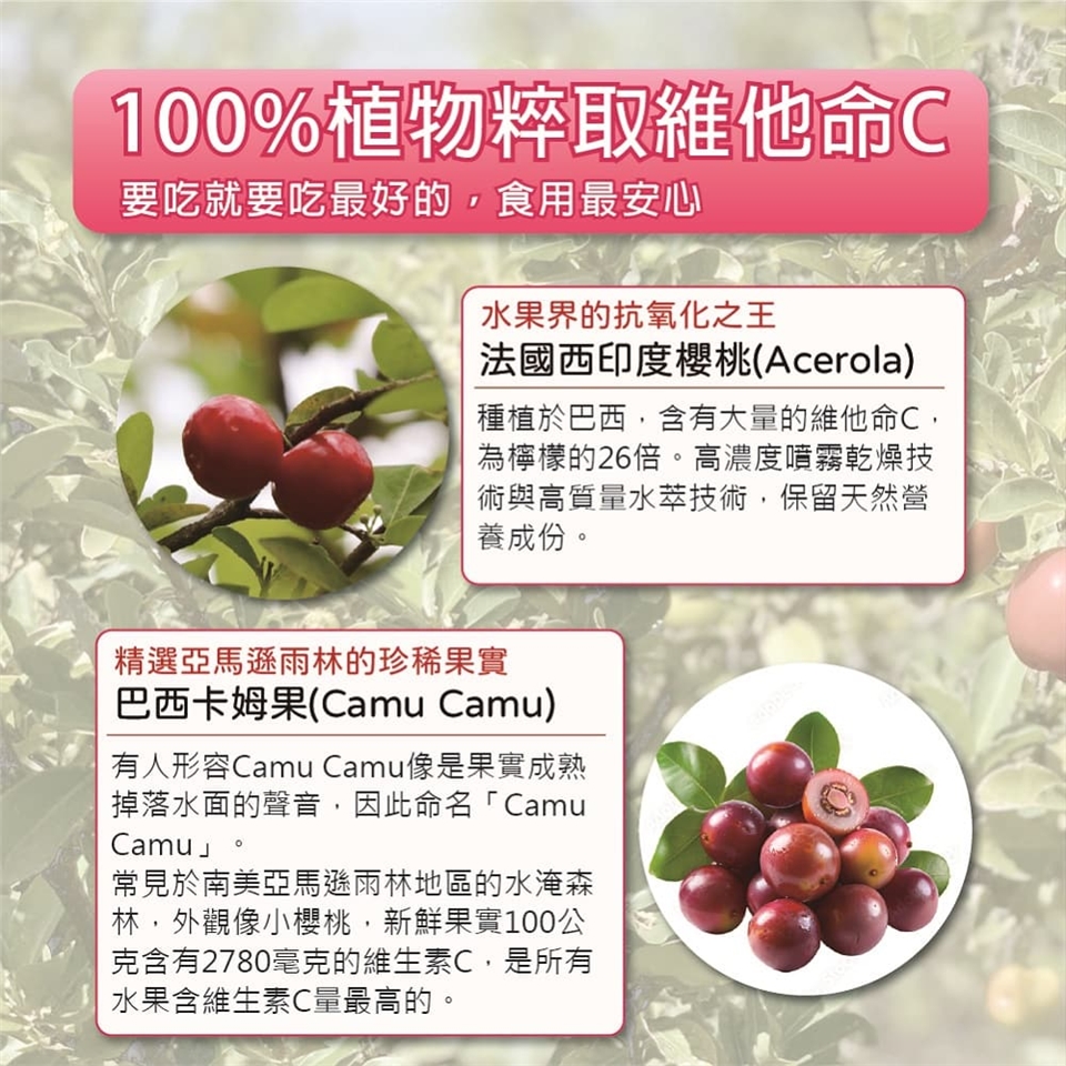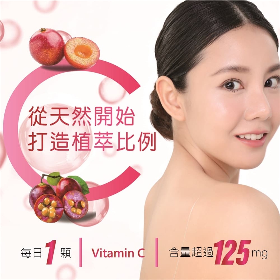 來自法國百年大廠NEXIRA獨家『水粹技術』,嚴選西印度櫻桃與亞馬遜雨林的珍稀果實-卡姆果Camu Camu,天然植物萃取二種維生素C,營養全面升級。100%天然純粹,高吸收、高效能,無化學合成添加。有助於促進膠原蛋白形成、促進鐵吸收、維持肌膚明亮光澤好氣色,高生物利用率,成就大自然的抗氧化之王!每顆含有125毫克維生素C,一天1顆剛剛好,守護每日的營養健康。