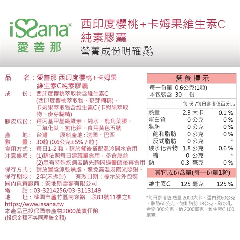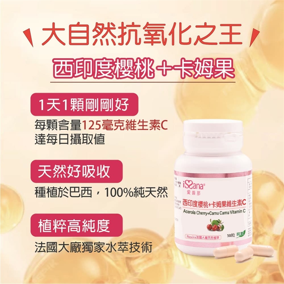 ▎品名 : 【愛善那】 西印度櫻桃+卡姆果維生素C純素膠囊 30顆/瓶