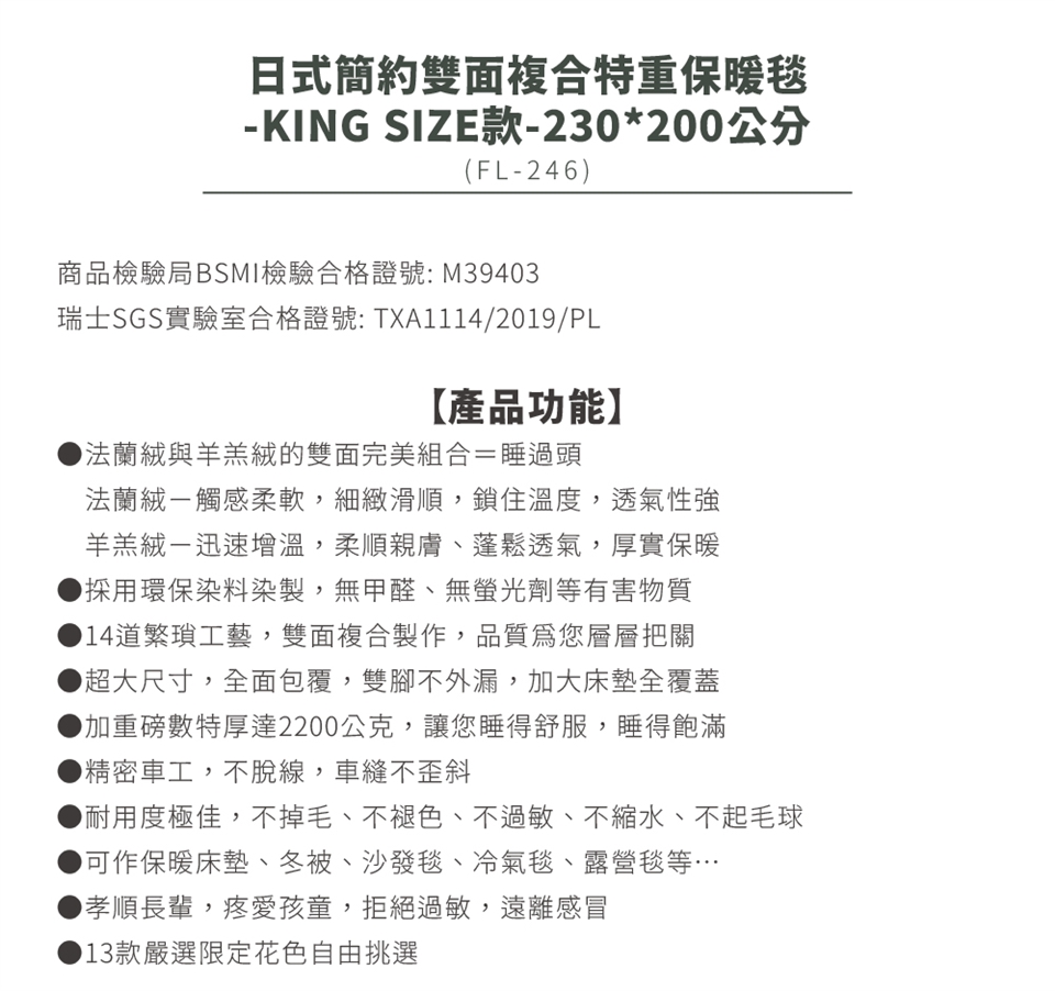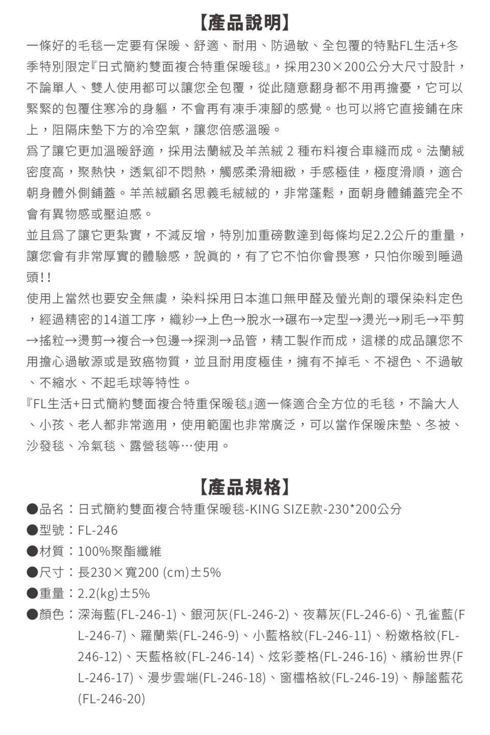 由於法蘭絨作工繁瑣,出廠前有平剪程序,也就是剛做好的絨料,絨面的絨毛長度長短不一,為使其更加舒適美觀會以此一工序將其絨毛長度修剪整齊,因此您收到的產品可能會有平剪後所殘留的絨毛,新品收到時可先至空曠處將殘留毛料拍打掉再行使用,但此非掉毛,為避免不必要的誤會。