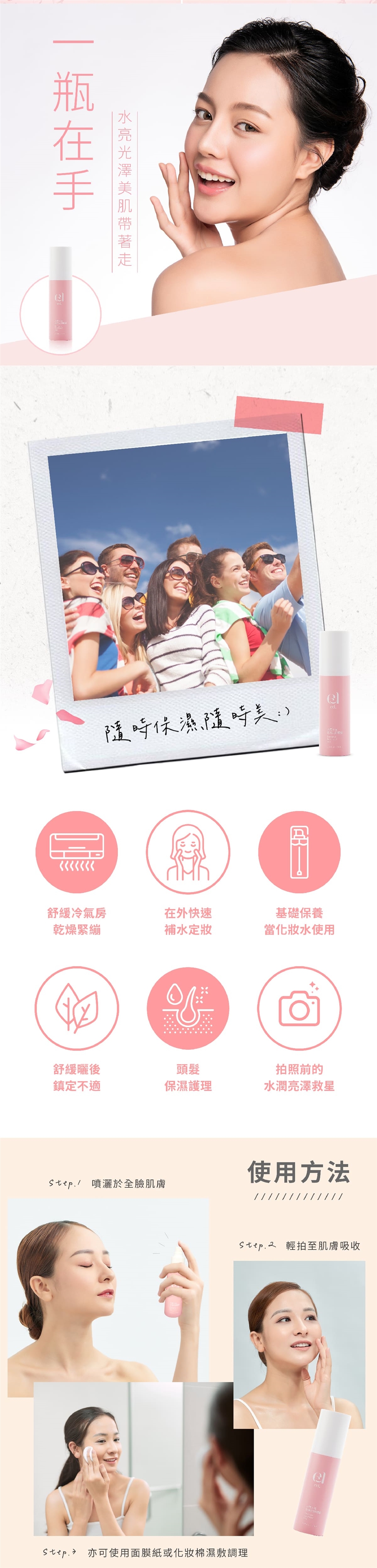 直接噴灑於全臉肌膚後輕拍至吸收。亦可使用面膜紙或化妝棉濕敷調理