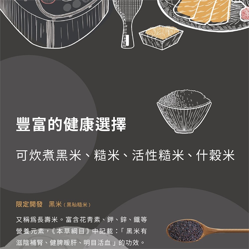 (5)豐富的健康選擇,可炊煮黑米、糙米、活性糙米、什穀米。