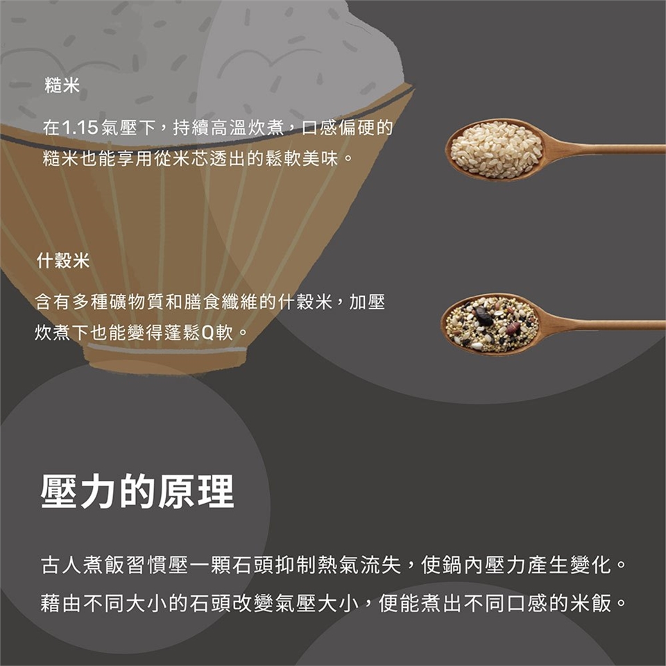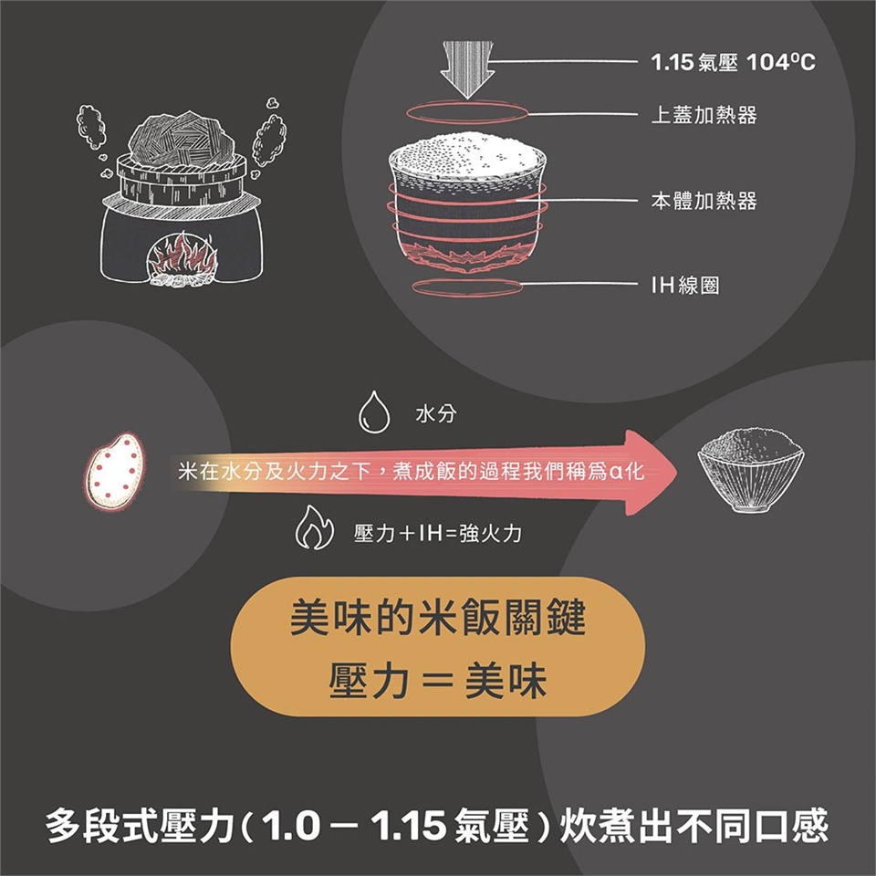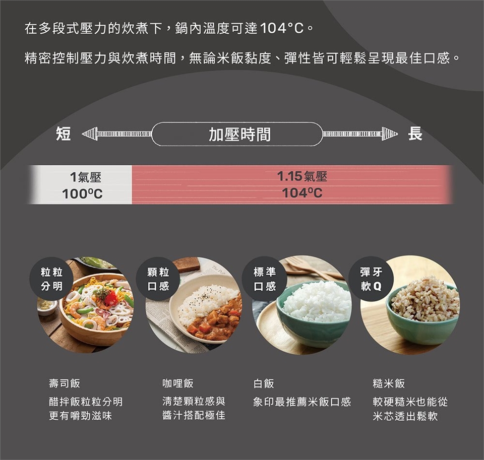 (3)「多段式壓力(1.0~1.15氣壓)」,炊煮出不同口感。