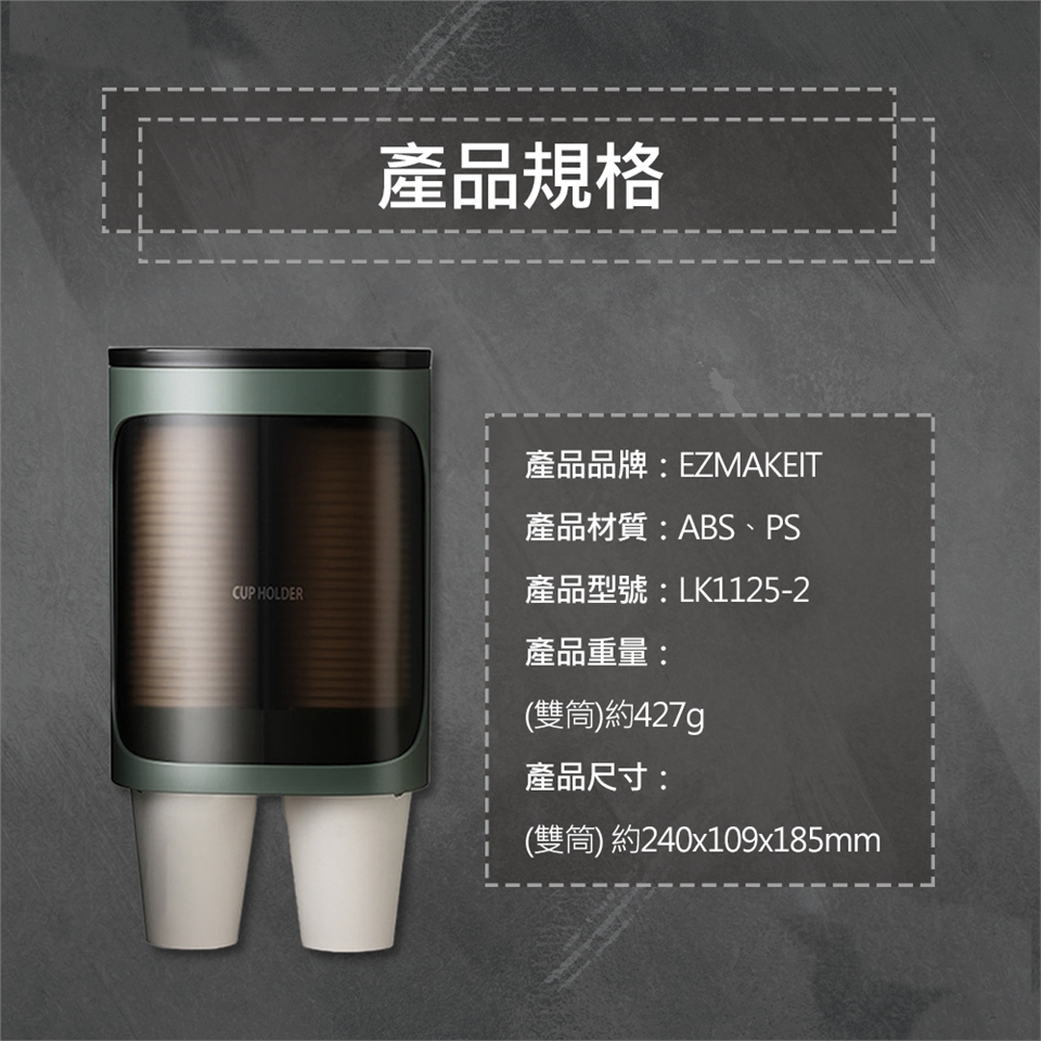 商品詳細介紹 EZmakeit-LK1125-2簡約雙筒自動取杯器 產品品牌:EZMAKEIT產品材質:ABS、PS產品型號:LK1125-2產品重量:(雙筒) 約427g產品規格:(雙筒) 約240x109x185mm 產品特點:1.免鑽免釘2.強力背膠3.帶蓋防塵4.一次一杯5.可視杯倉6.加大容量 體驗說明 不可體驗 使用方法說明 請參考網頁說明 注意事項 -