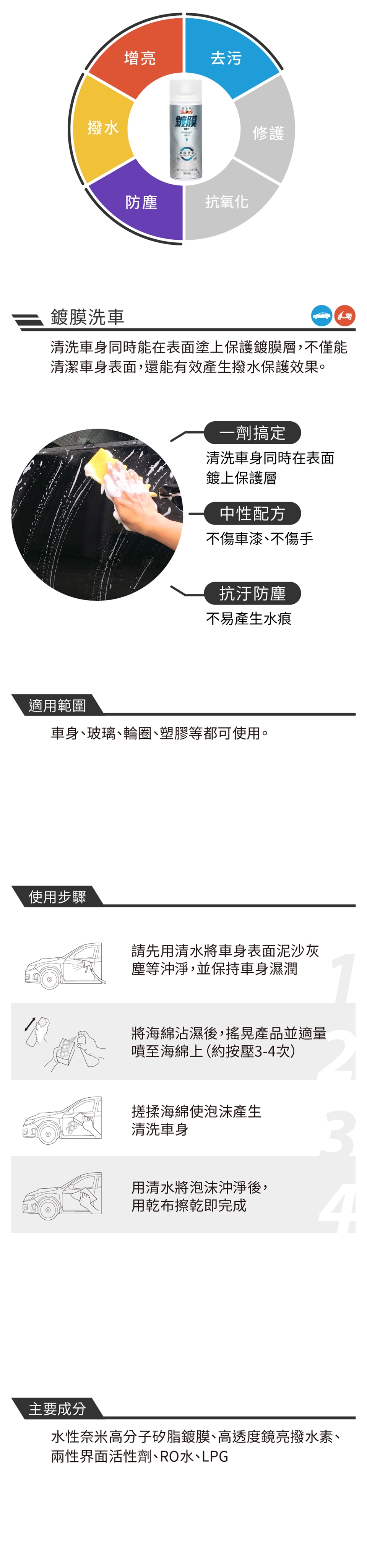 1.請先用清水將車身表面泥沙灰塵等沖淨,並保持車身濕潤 。