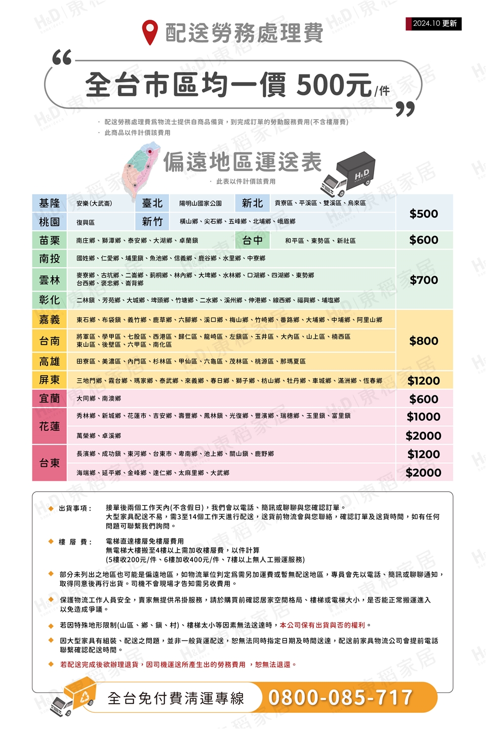 (9) 無回收家俱服務,若需回收家俱可聯絡當地請清潔隊回收。免付費清運專線:0800-085-717