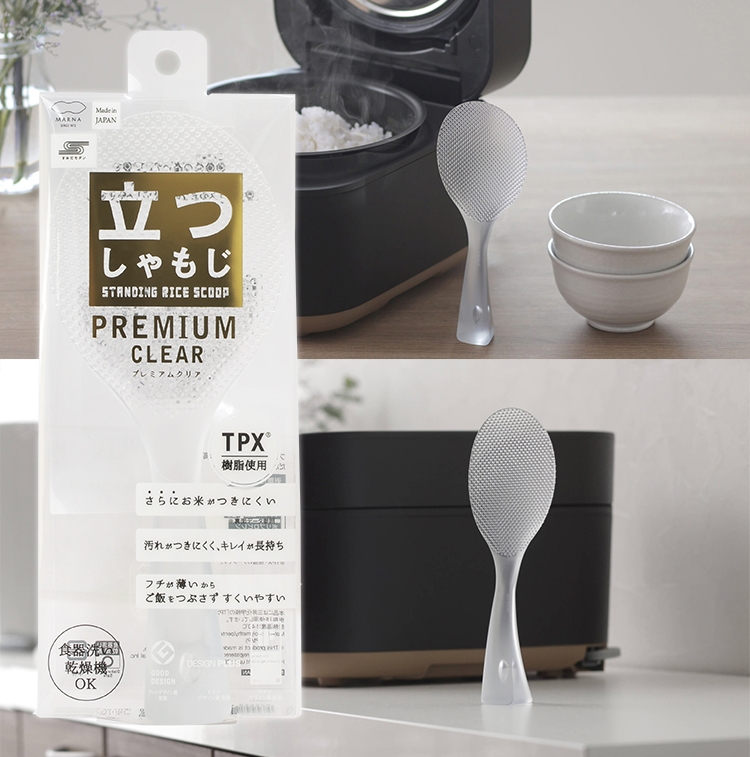 ●【品名】日本製MARNA可站立式TPX樹脂半透明感飯勺飯匙K-555CL(不易沾黏;三角錐型握把;耐熱140度/適洗碗機)
