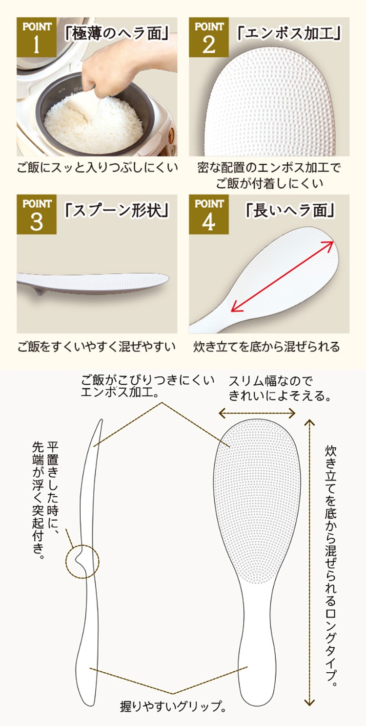 ●凹凸加工的表面,讓米飯不易沾黏到飯勺上。