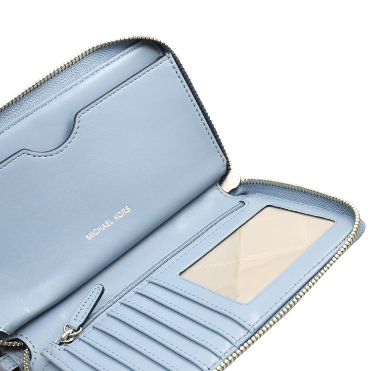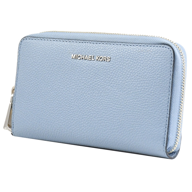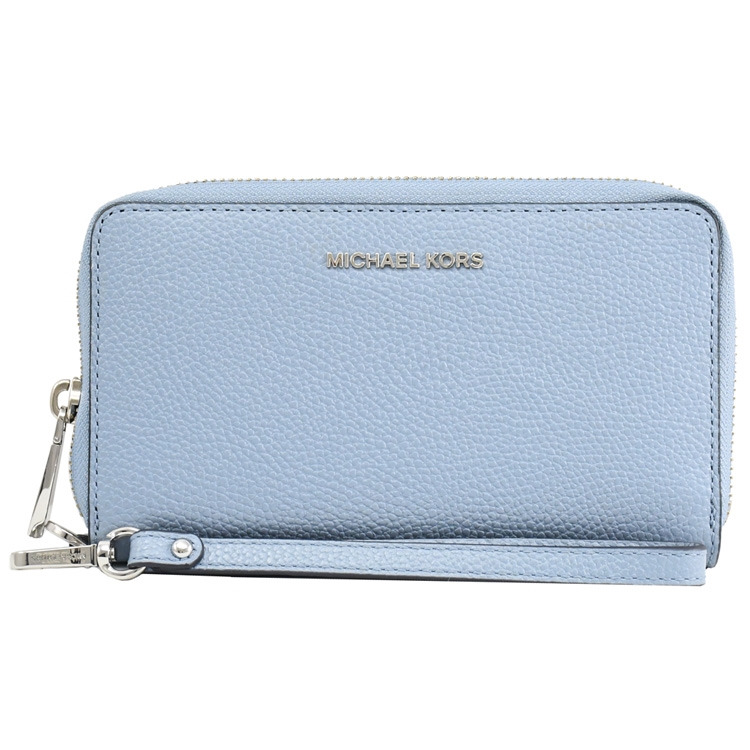 MICHAEL KORS 品牌(簡稱MK)成立於 1981 年是美國設計師同名的品牌;專櫃商品,此款是專櫃熱銷經典款手提式中夾,可當手拿包使用,採用浮雕金屬LOGO與荔紋皮革材質,拉鍊開口/內6信用卡夾+1透明夾層+1夾層+1拉鍊袋+1可放5.5吋手機夾層,活動手提把可單獨使用當吊飾或鑰匙扣環,官網熱銷款,整體簡約時尚又實用。