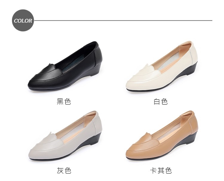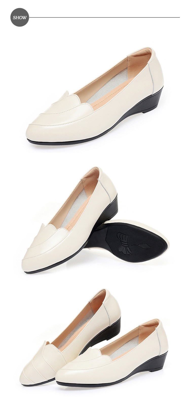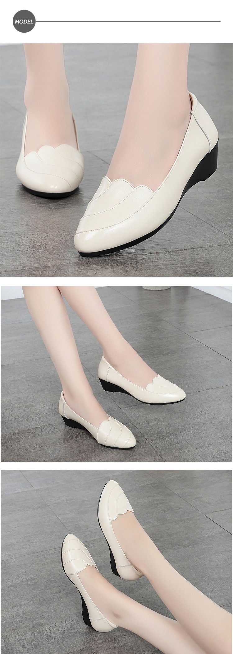 【MOM】跟鞋 坡跟鞋/真皮小尖頭流線花邊鞋口舒適坡跟鞋 米