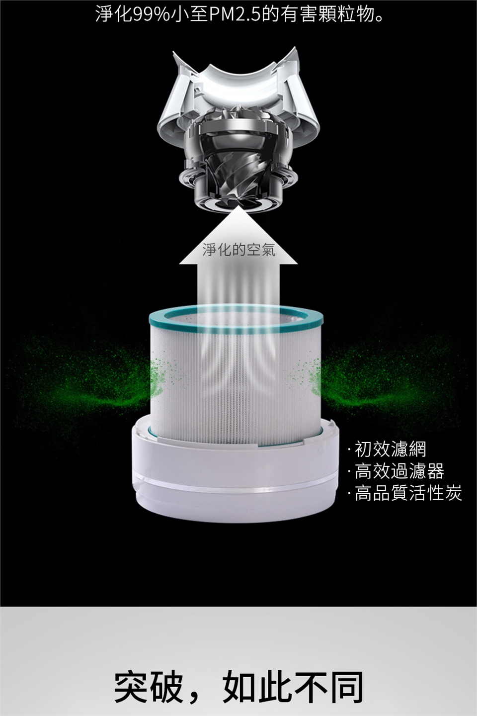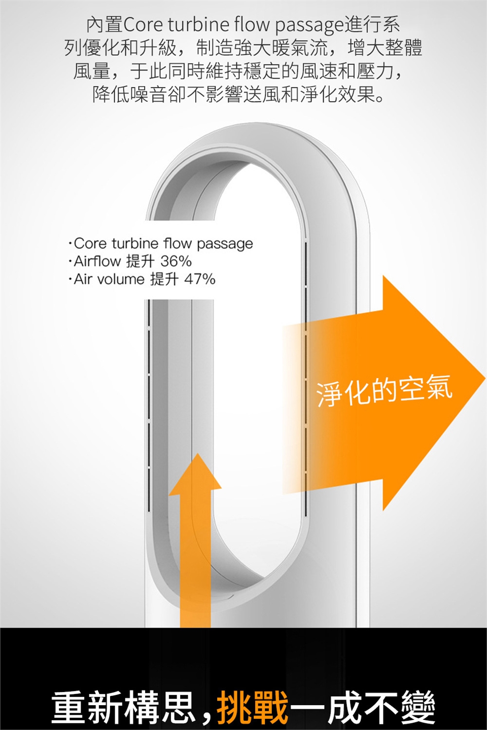 內置Core turbine flow passage進行系列優化和升級,製造強大暖氣流,增大整體風量,於此同時維持穩定的風速和壓力,降低噪音卻不影響送風和淨化效果。