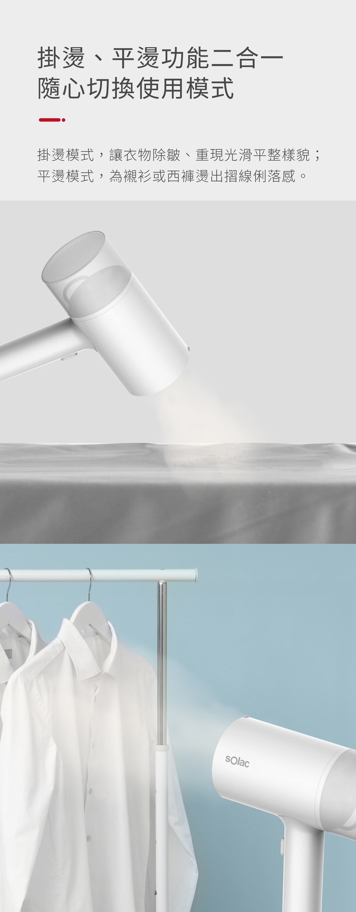 ●滴水不漏的設計,掛燙、平燙二合一。