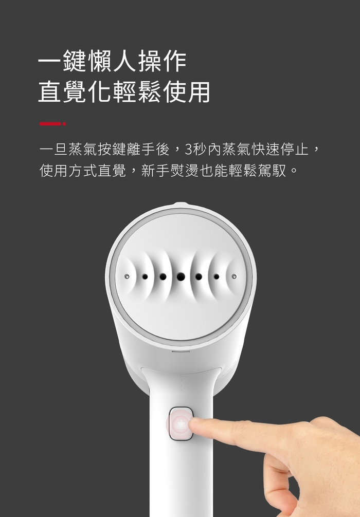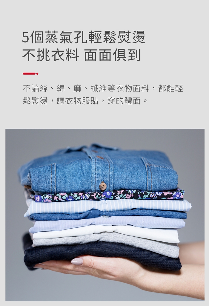 ●5個蒸氣孔輕鬆熨燙,層層滲透衣物服貼滑順。