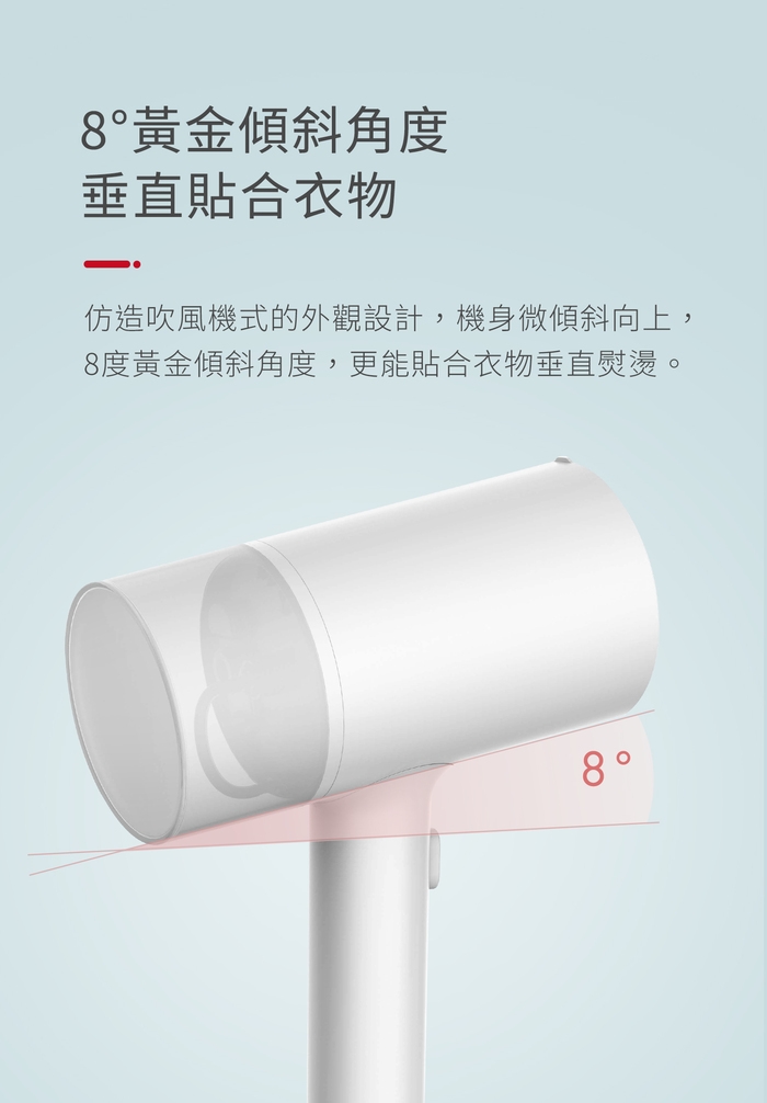 ●8度黃金傾斜,垂直貼合衣物,蒸氣直線穿透衣物。